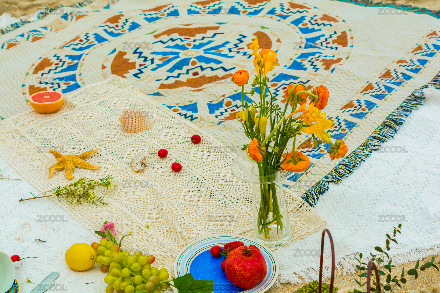 在沙滩上享受美丽的风景和吃新鲜的水果