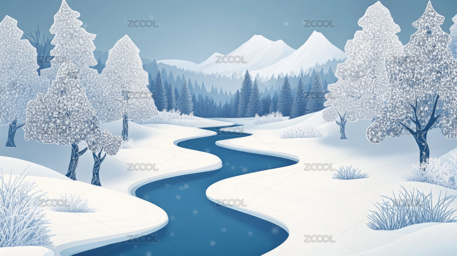 冬季雪景中的河流场景插画