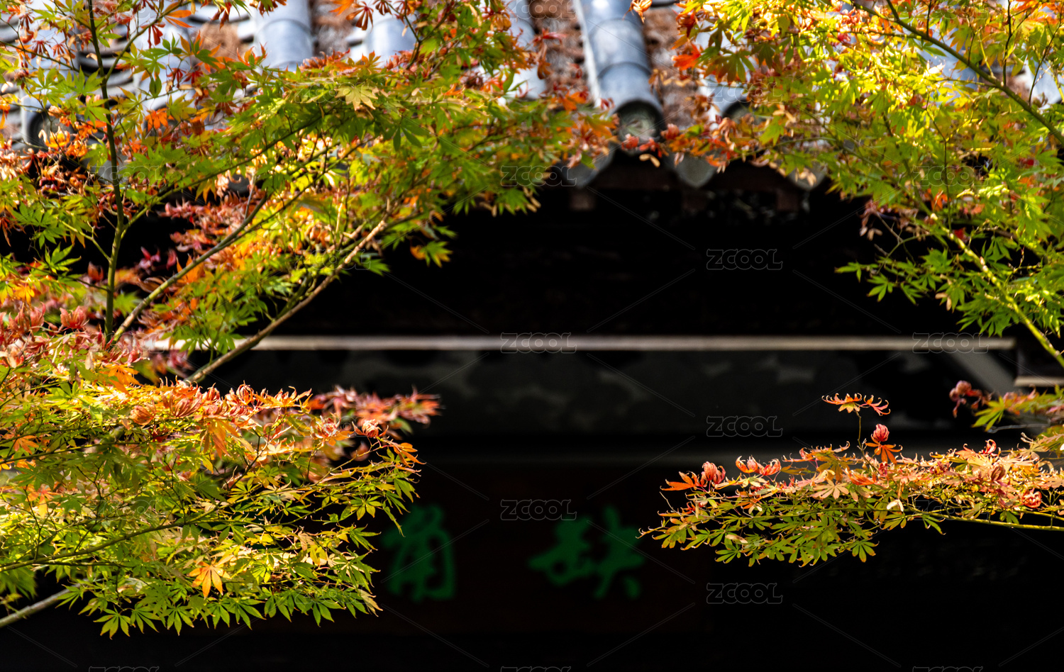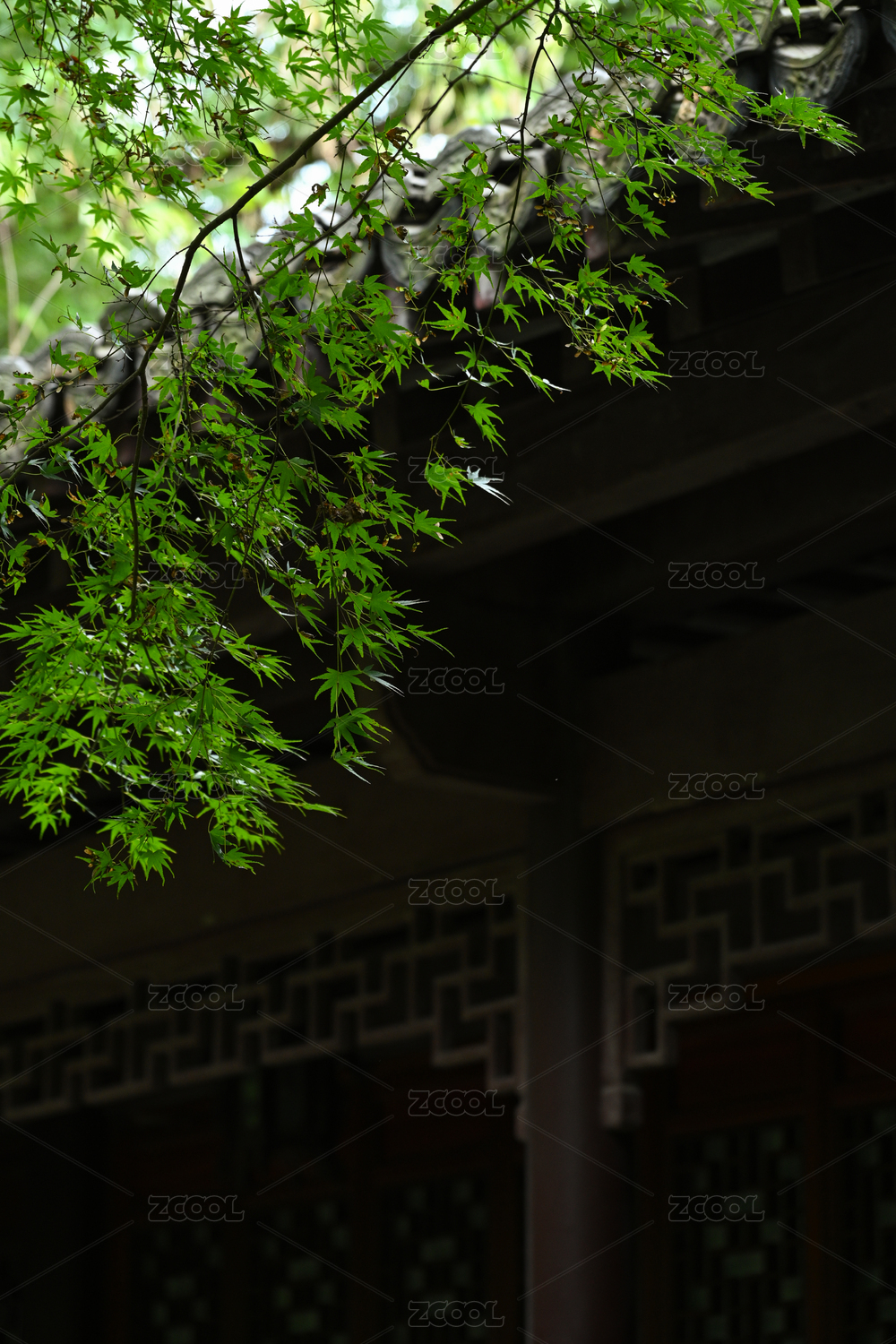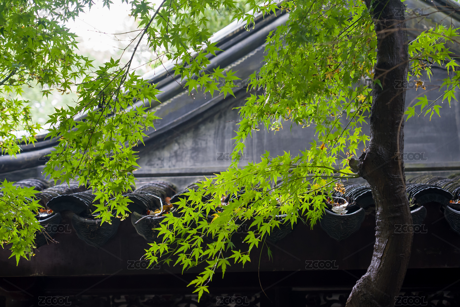 浙江杭州西湖旁房屋的鸡爪槭树叶特写