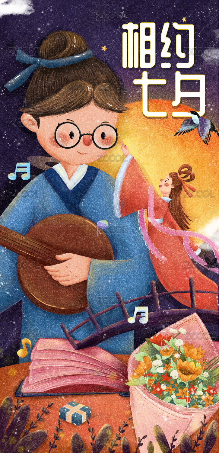 情人节牛郎织女奏乐相约七夕手绘竖版海报