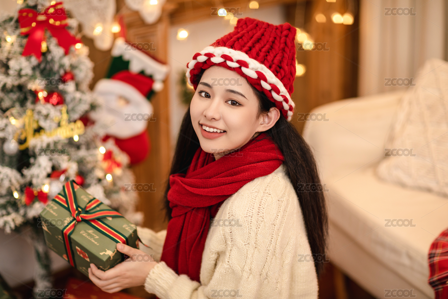 圣诞节年轻女孩坐在沙发上笑容灿烂