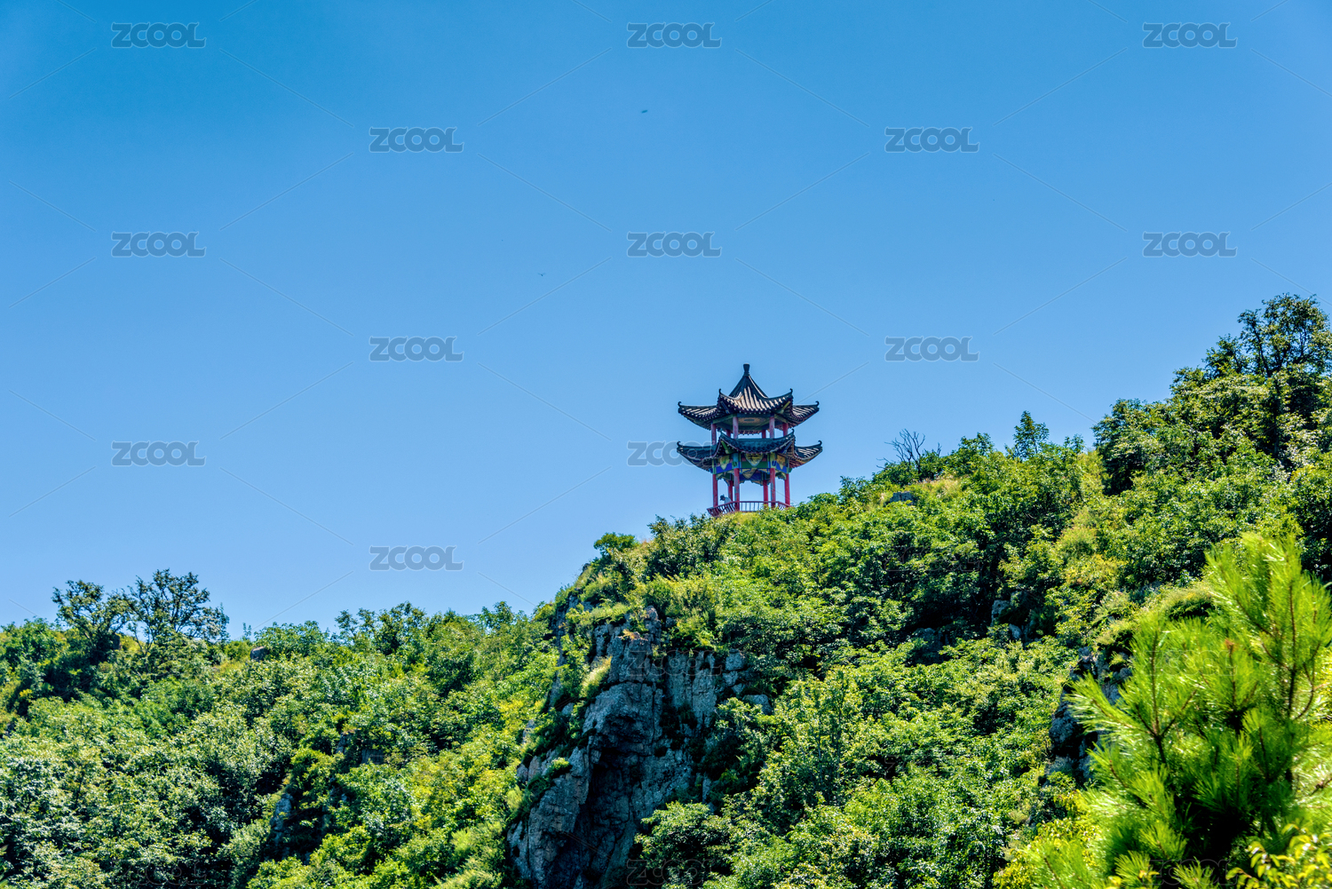 中国广西柳州驾鹤山 蓝天下山顶的中式凉亭