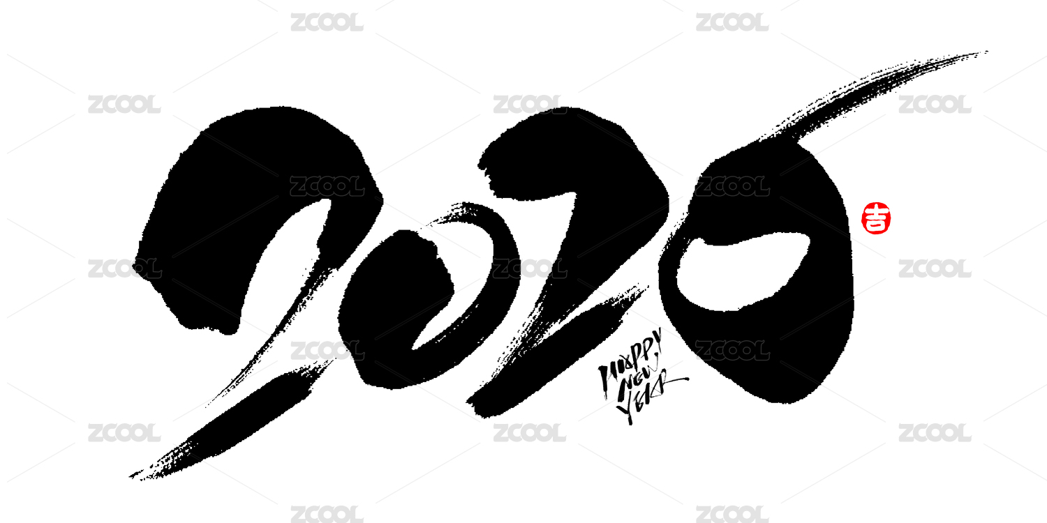 插画,矢量,字体,2020,鼠年,新年,书法,笔触,水墨,黑白