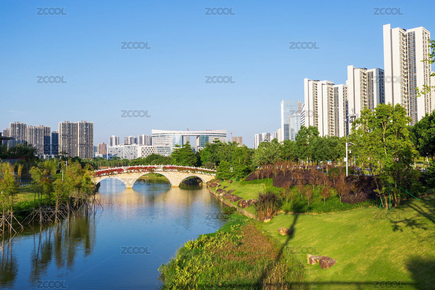 中国广州市南沙区蕉门CBD建筑和凤凰湖公园风光