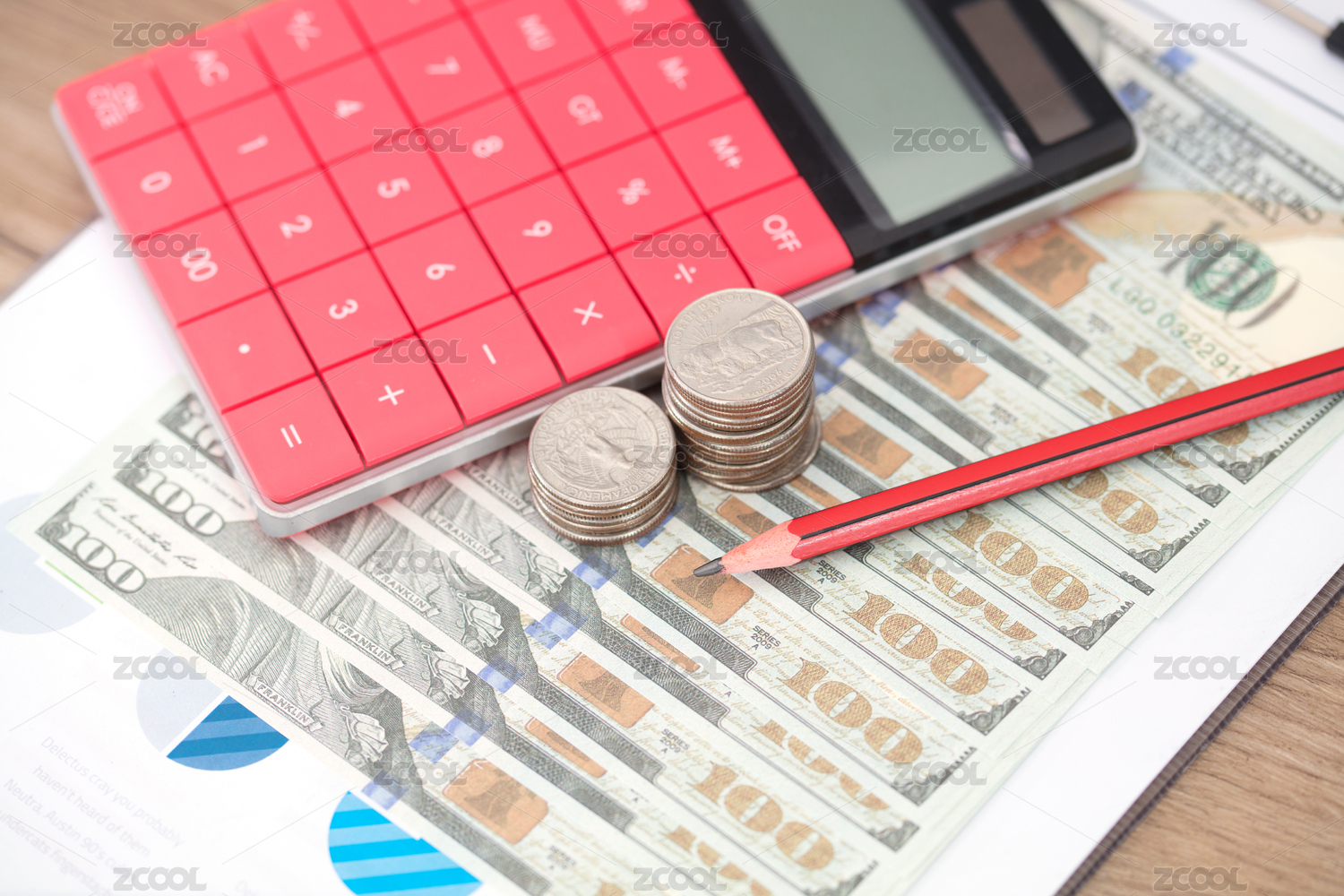 个人理财。 财务报告。 钱硬币和计算器在商业数据表上
