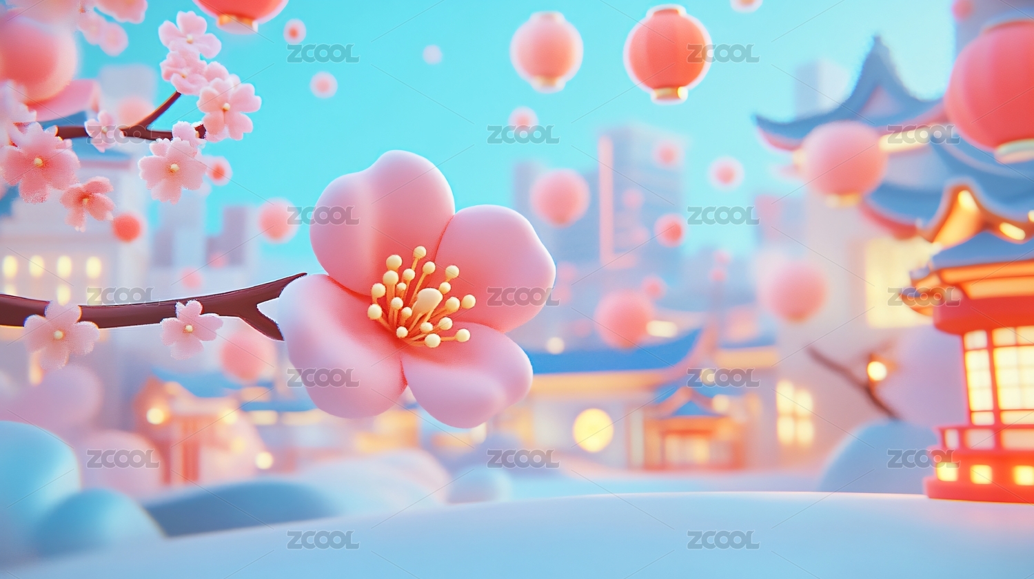 古风飞檐灯笼点缀盛开桃花的温暖画面