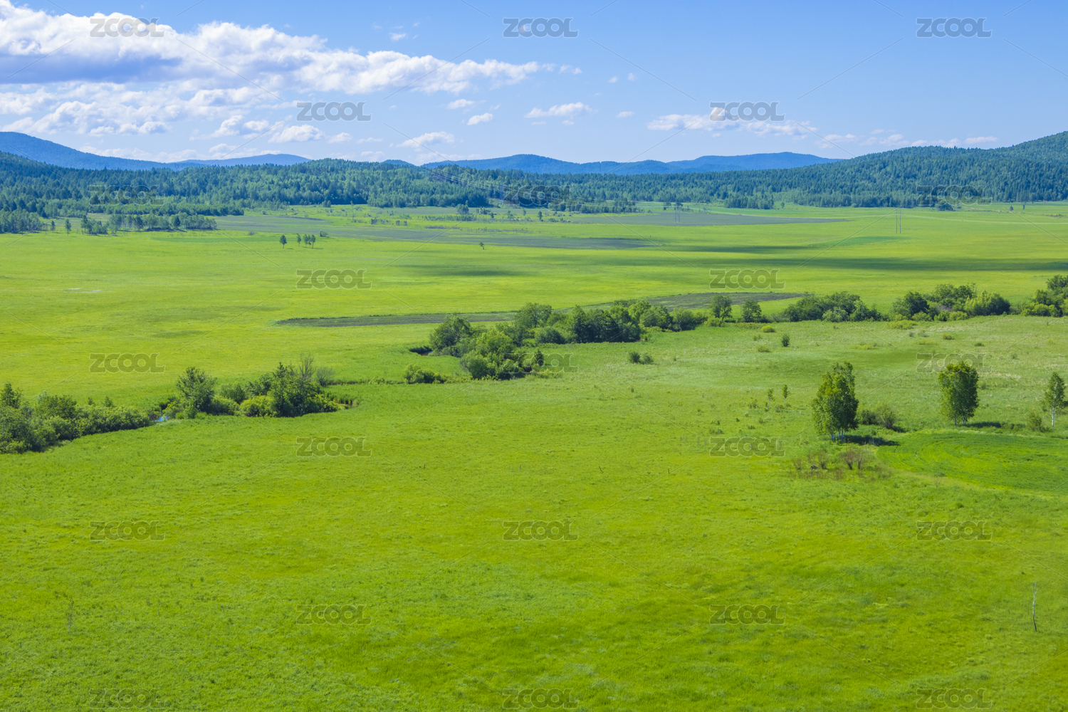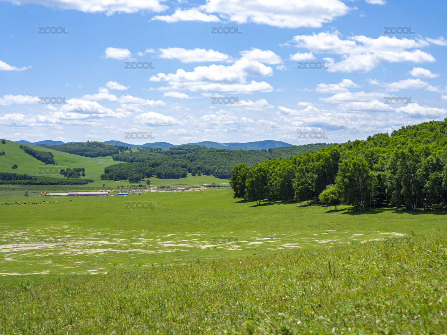 中国大兴安岭蓝天白云下的森林与草地