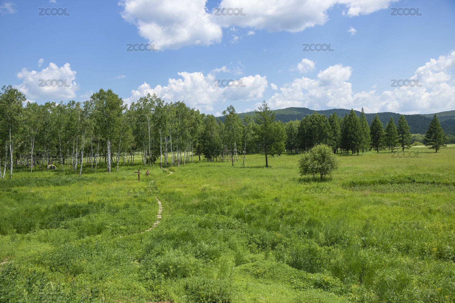 中国大兴安岭蓝天白云下的森林、草地和小路