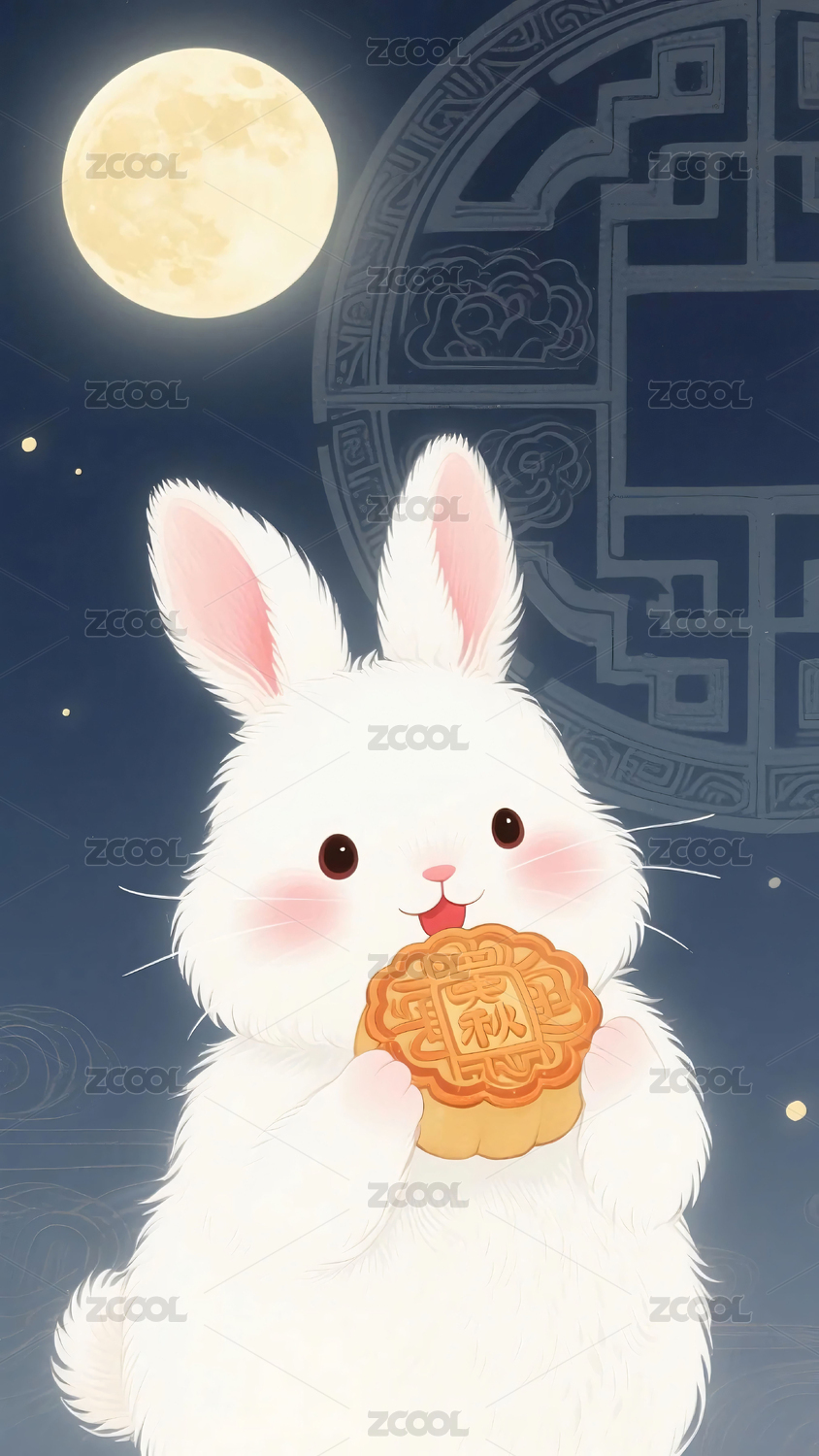 中秋节满月背景下正在吃月饼的可爱玉兔