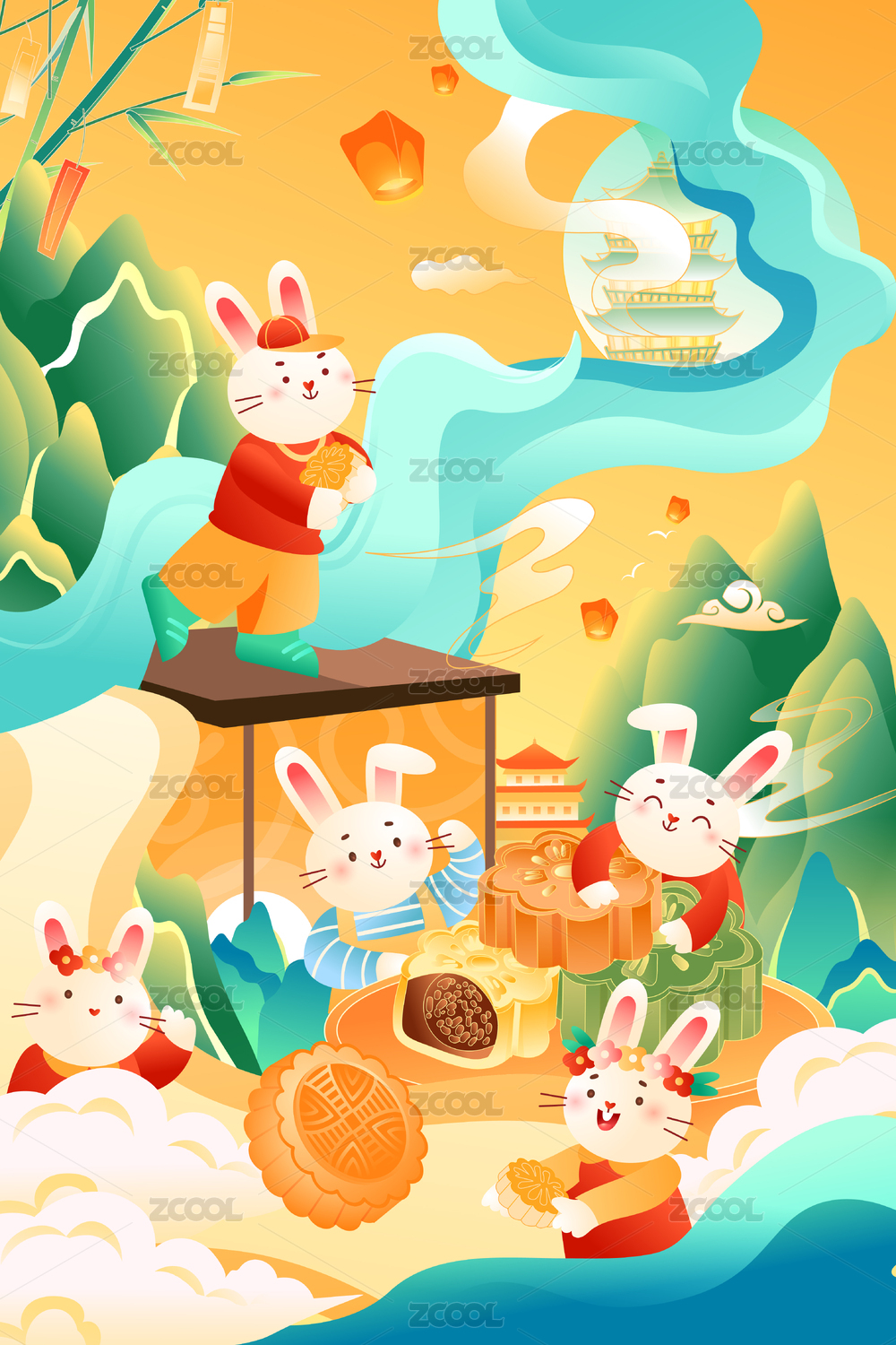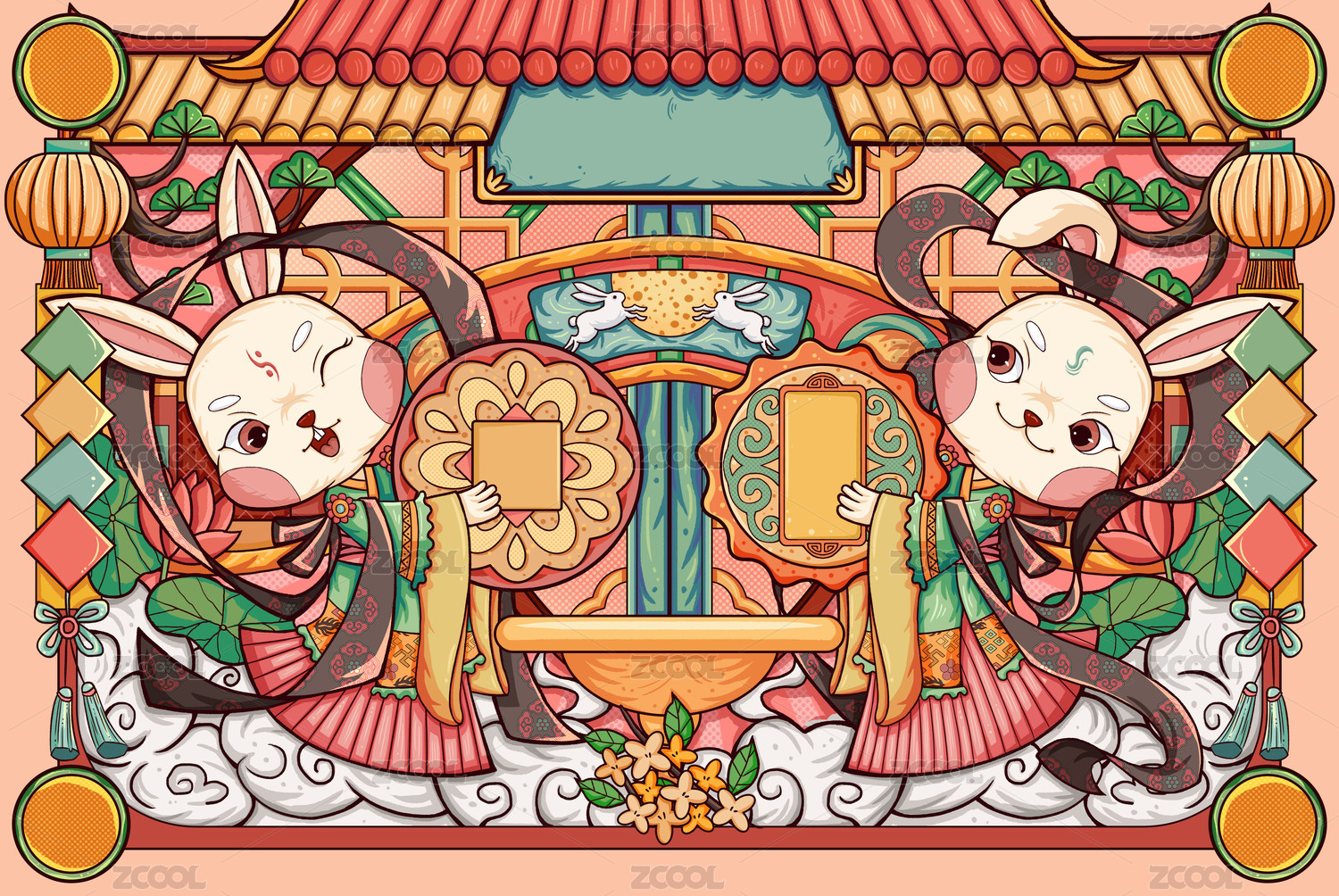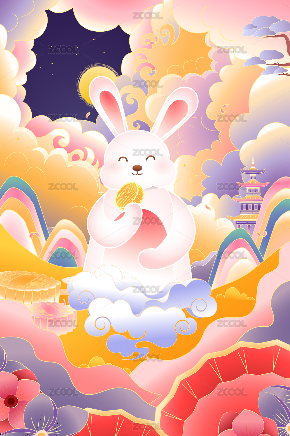 可爱兔子手捧月饼,采用彩色剪纸风格设计.