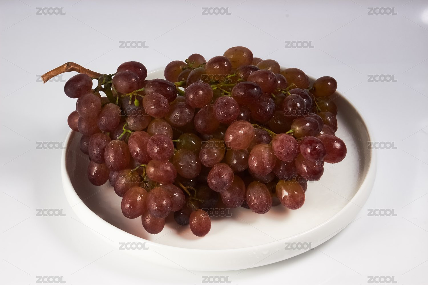 白色盘子里的一串新鲜葡萄水果