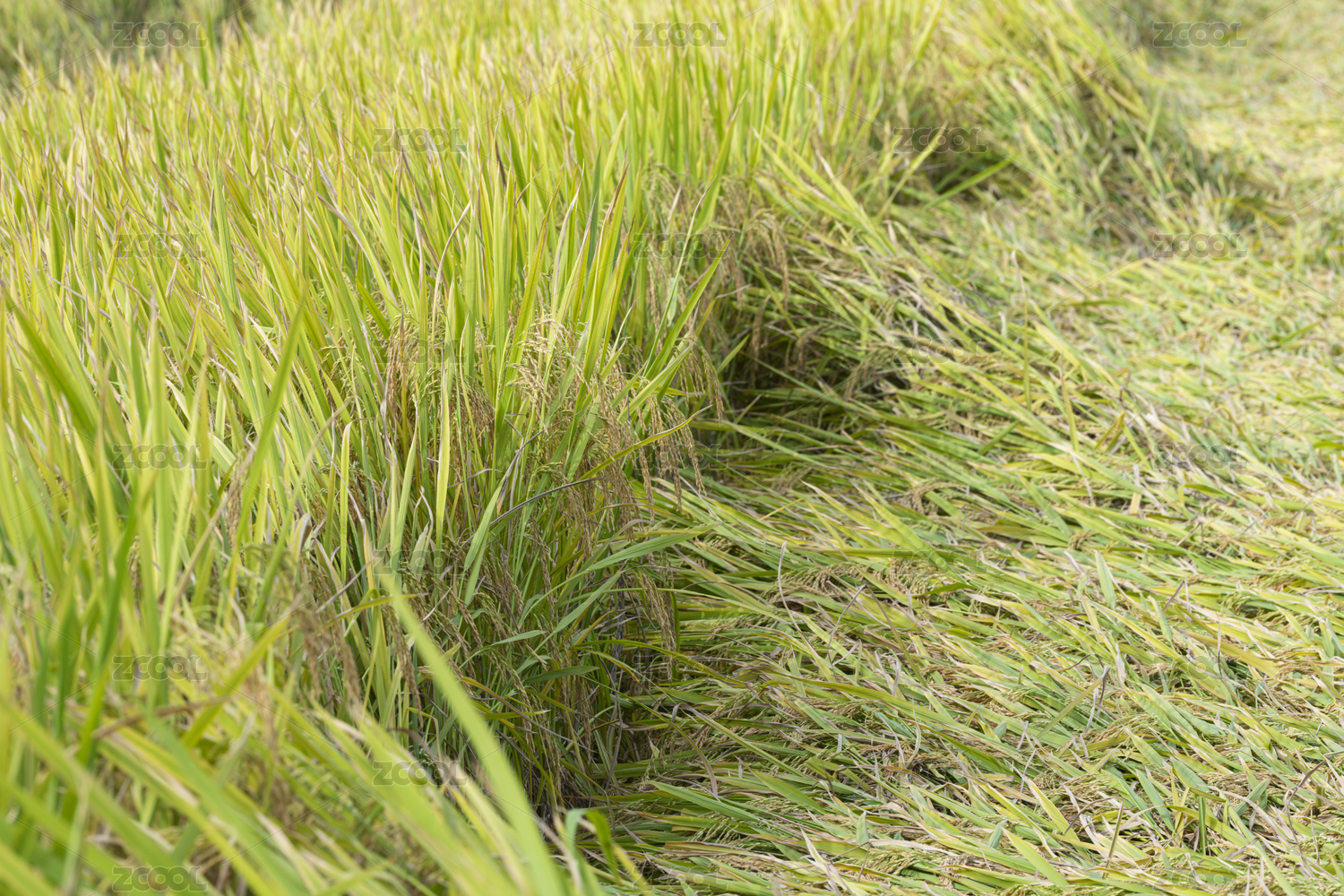 大面积风吹倒的水稻田