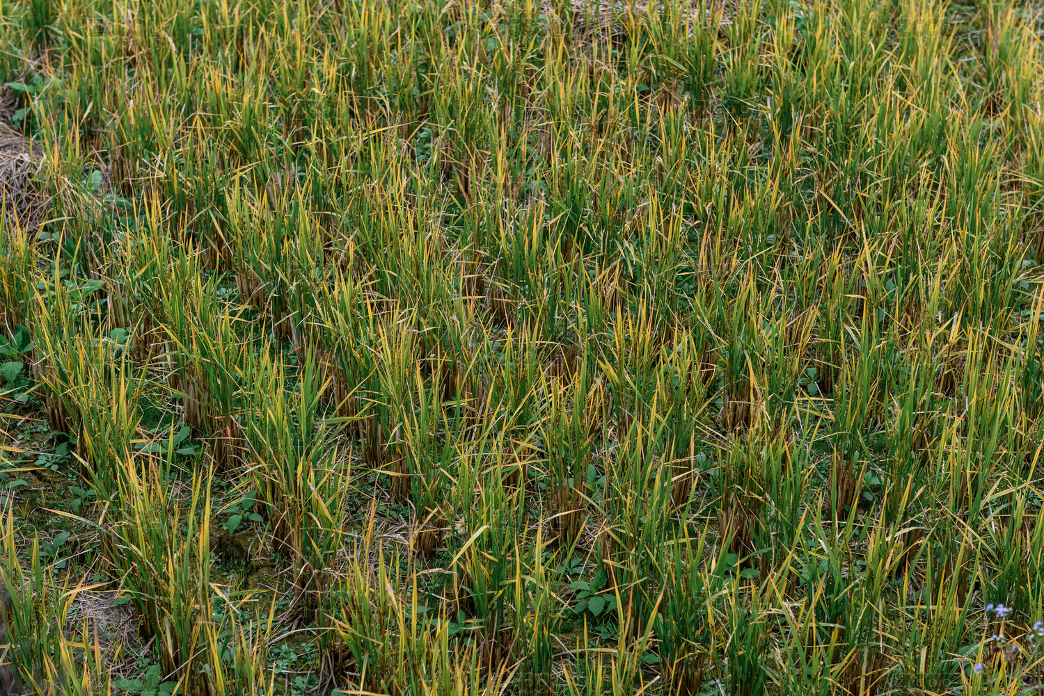 农田里收割水稻后长出的稻苗