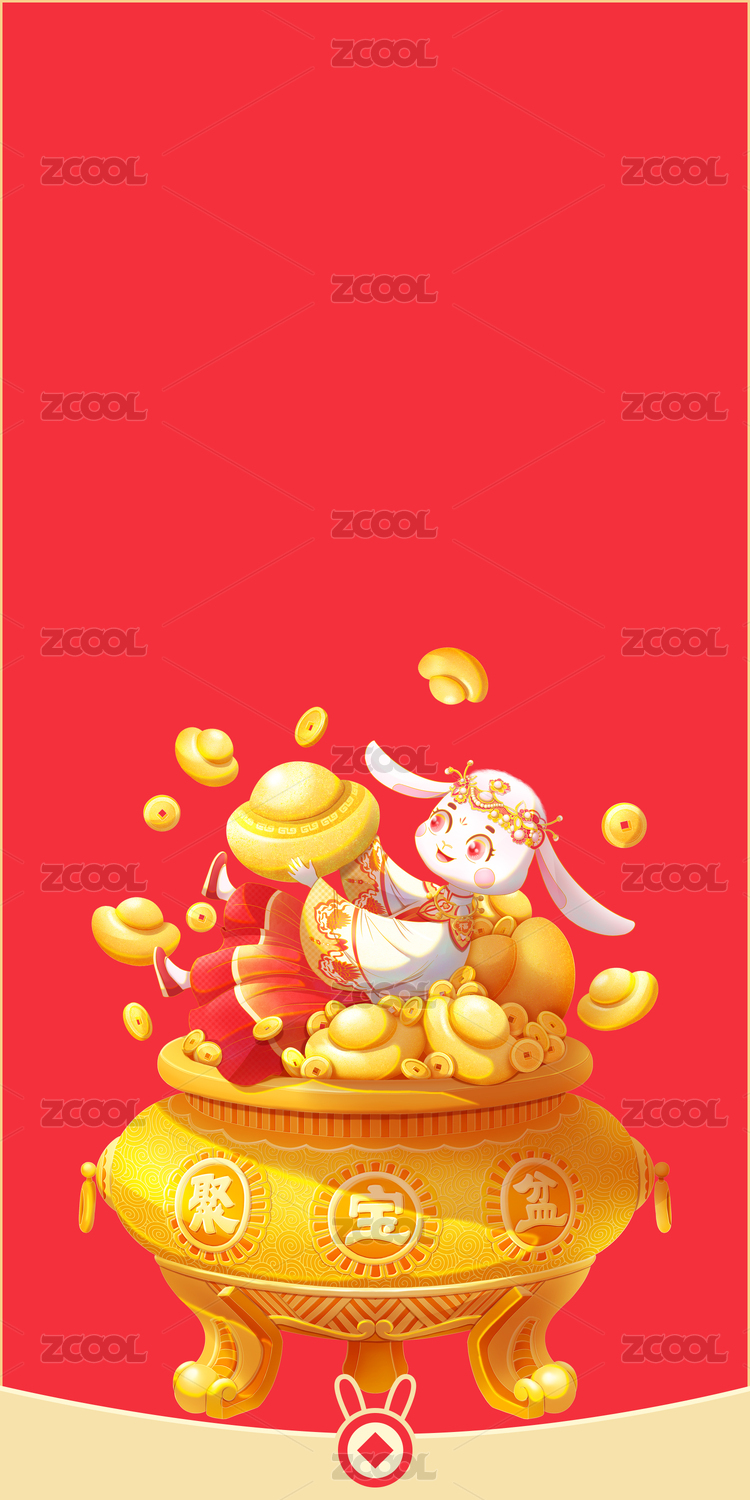 穿着汉服的兔子躺在聚宝盆上接金子