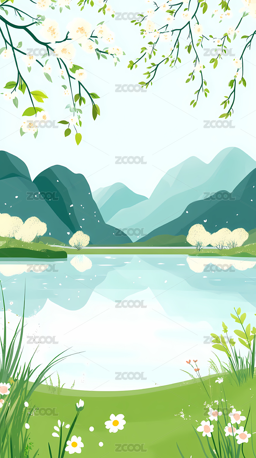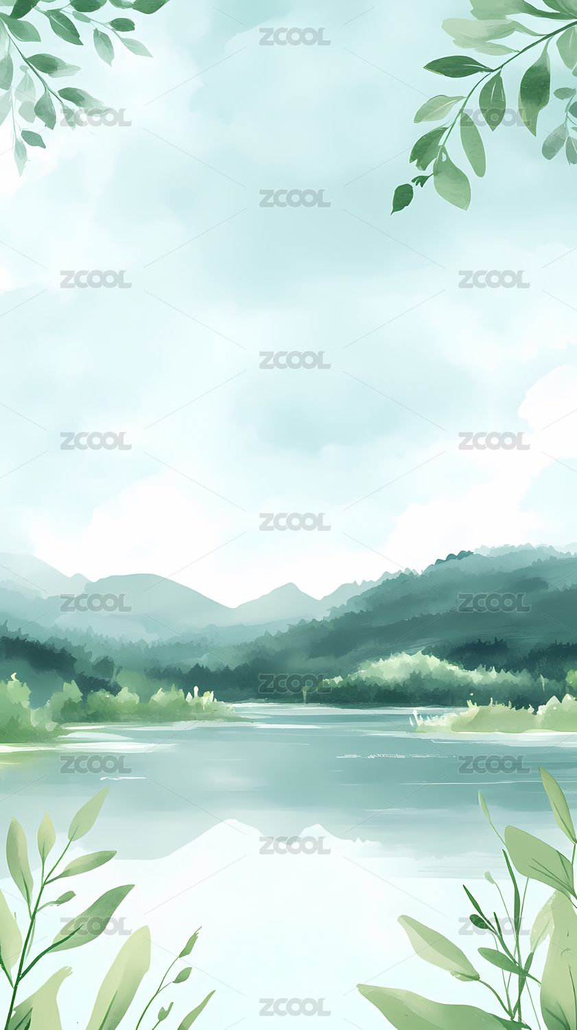 插画,小清新,绿叶,飘落,蓝天,白云,山水,绿色,生机,户外