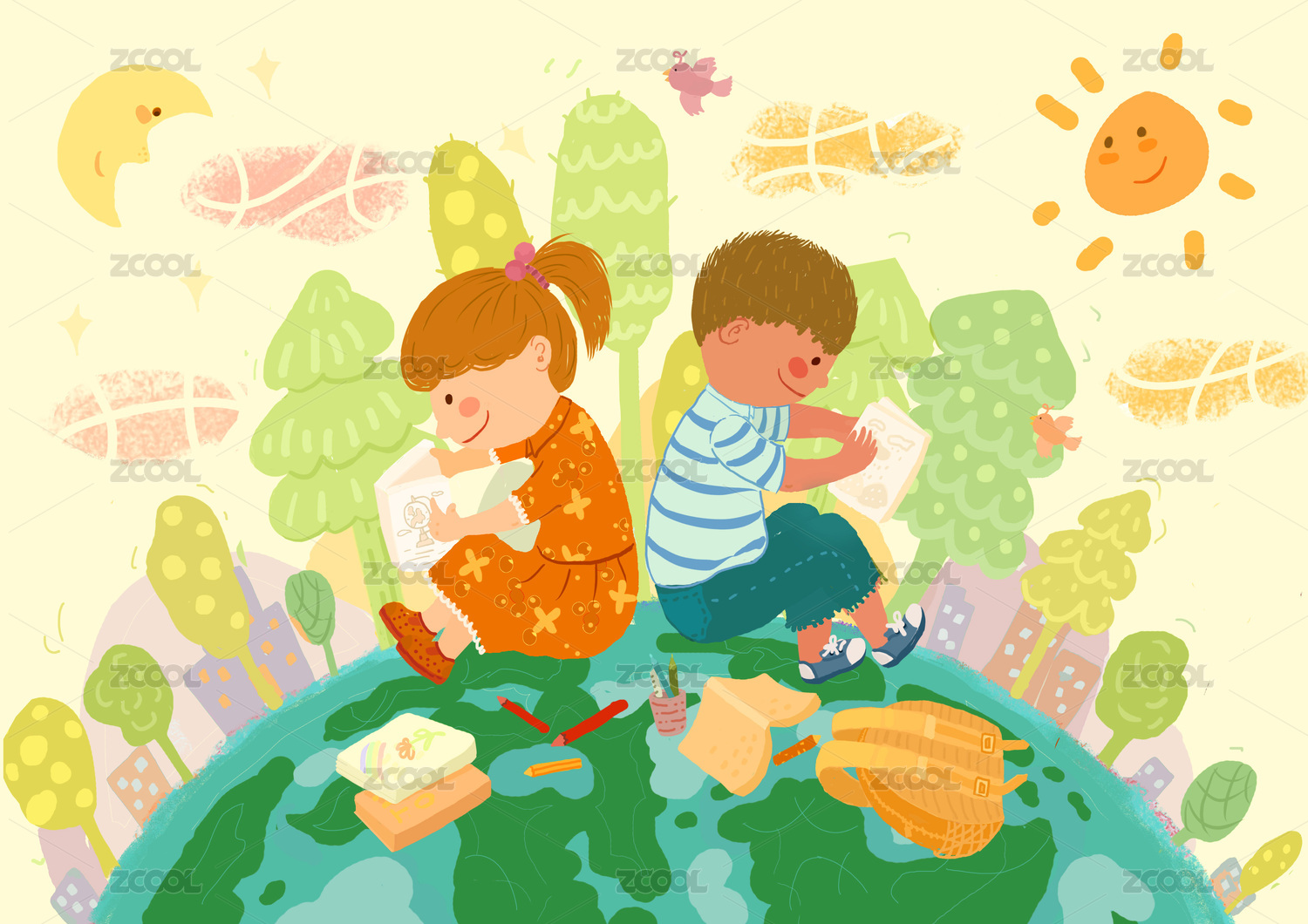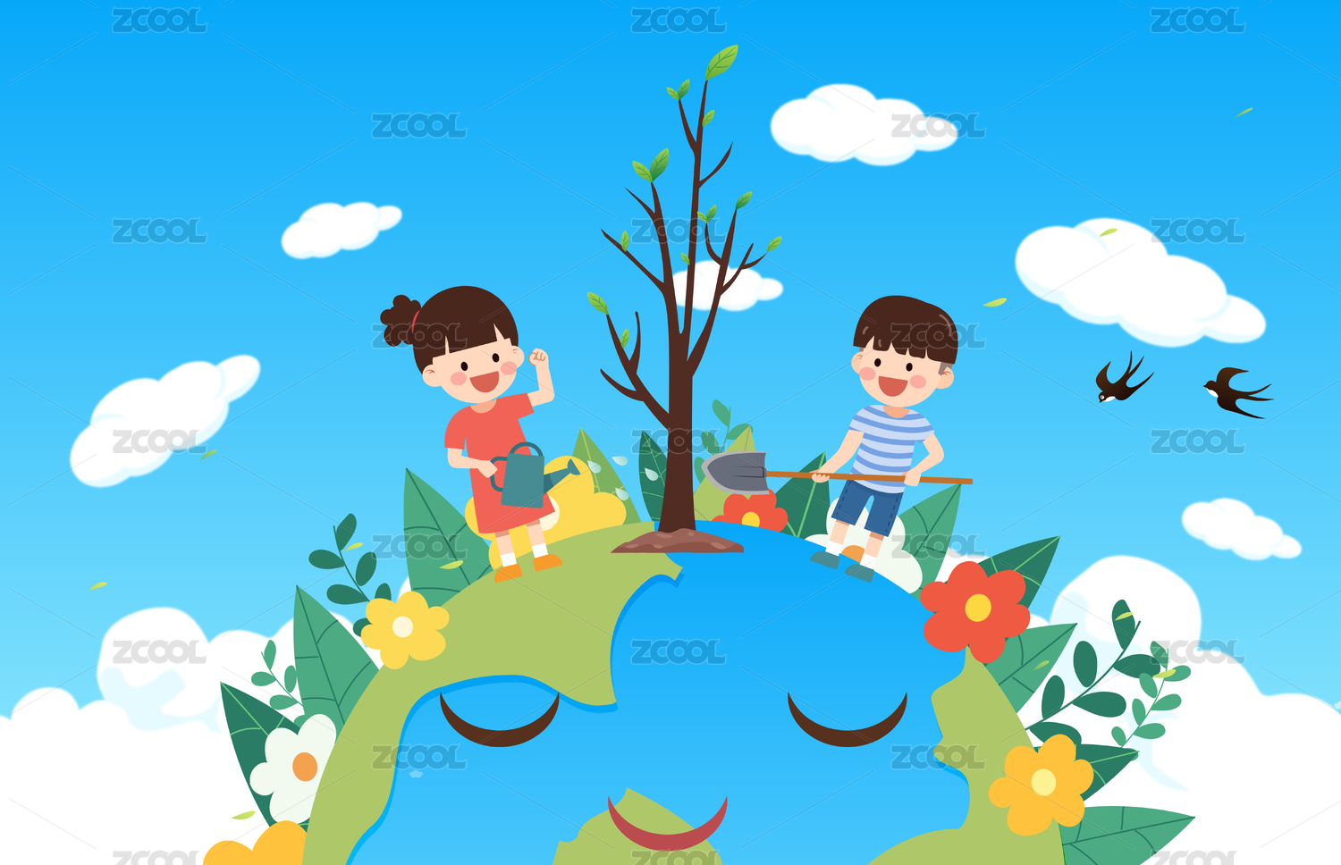 男孩女孩在地球上种树