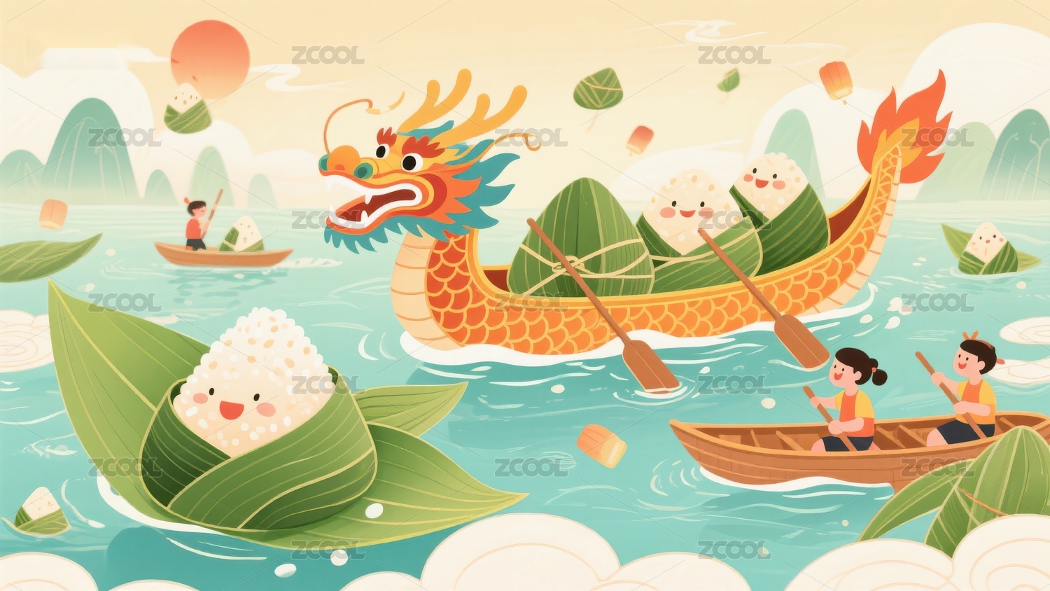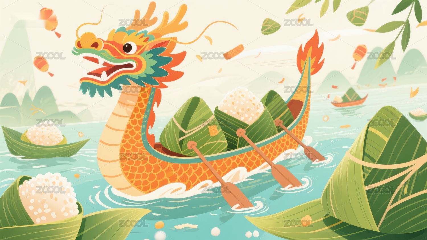 端午节赛龙舟传统节日活动粽子美食国潮插画