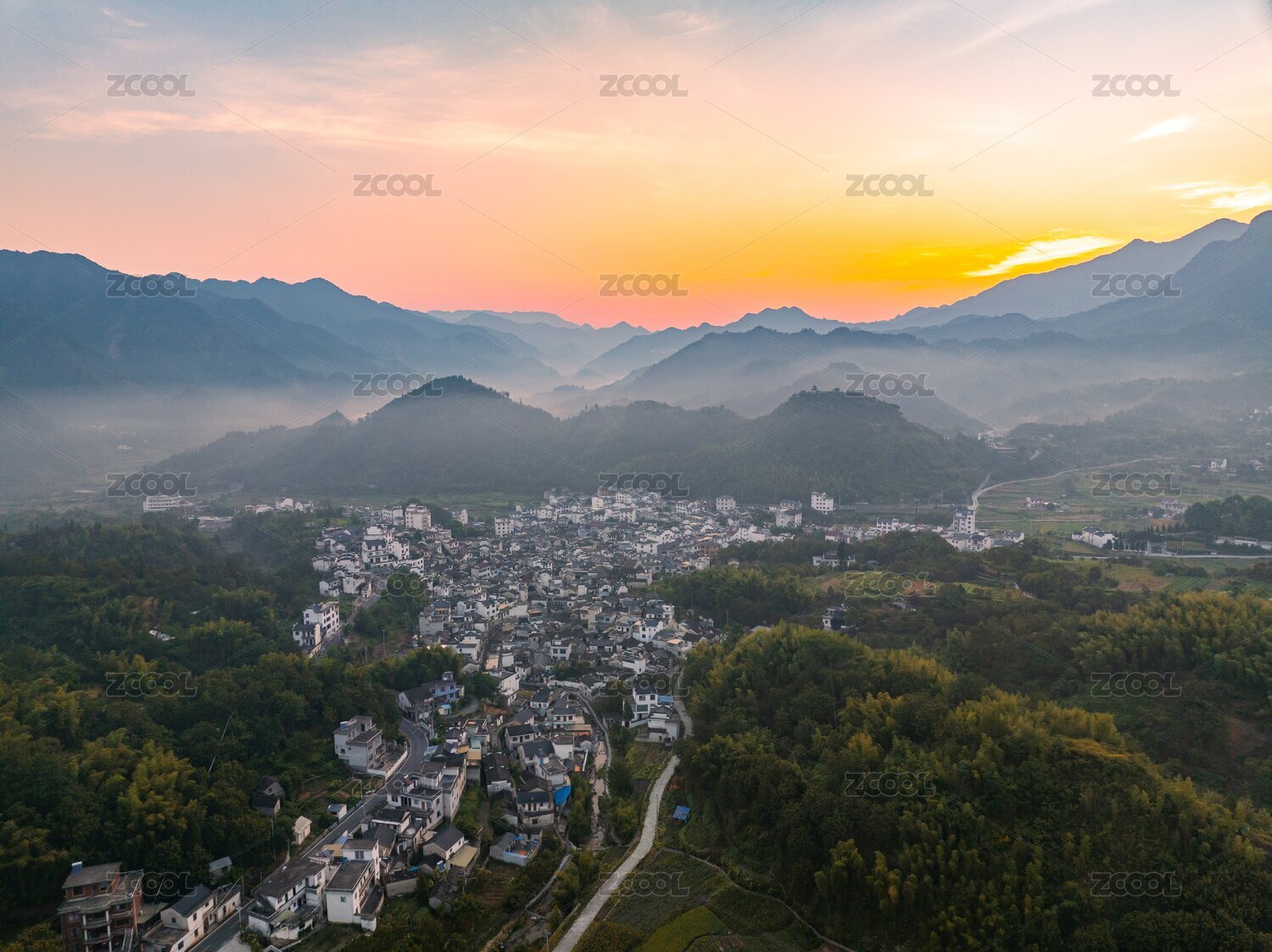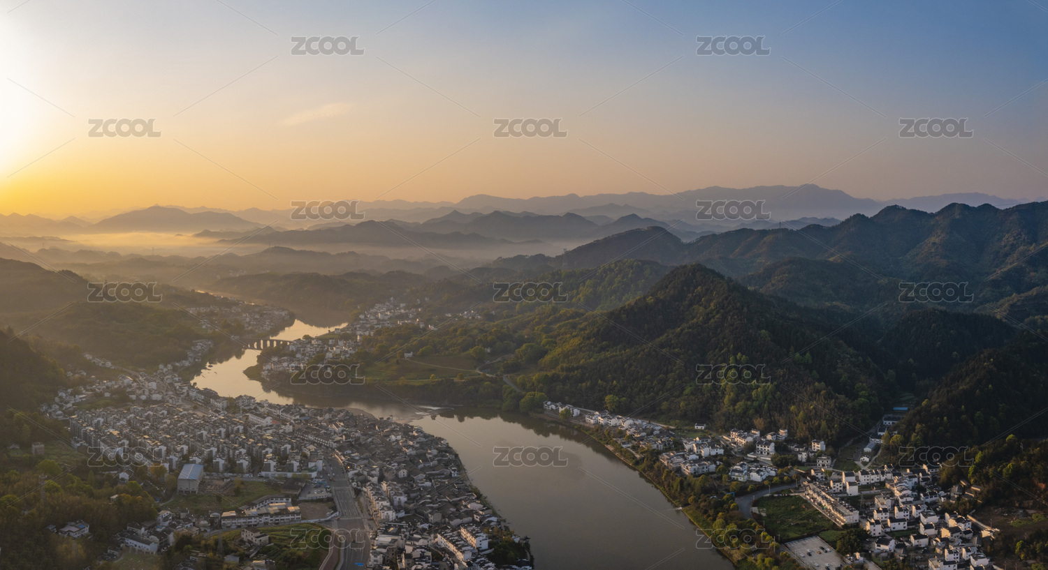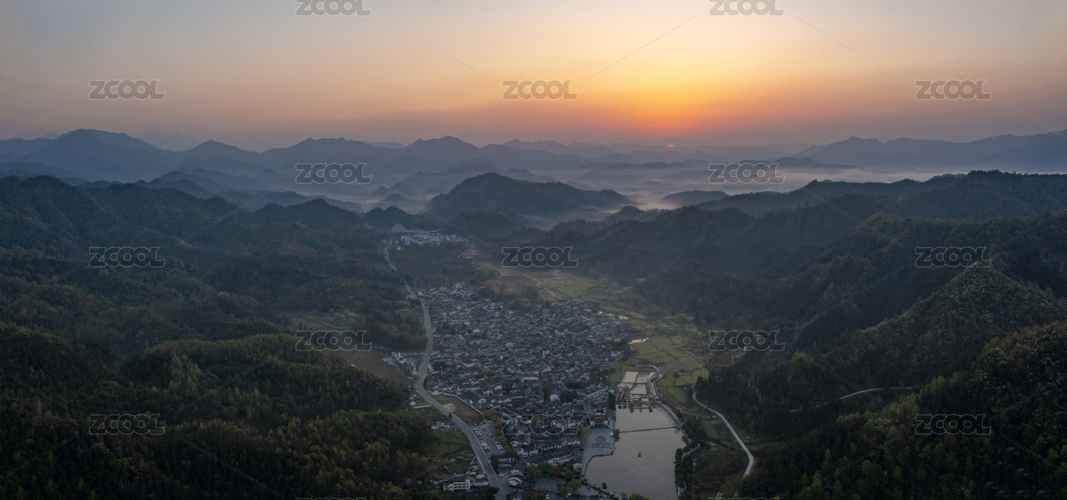 杭州桐庐深澳古村清晨日出全景宽幅航拍