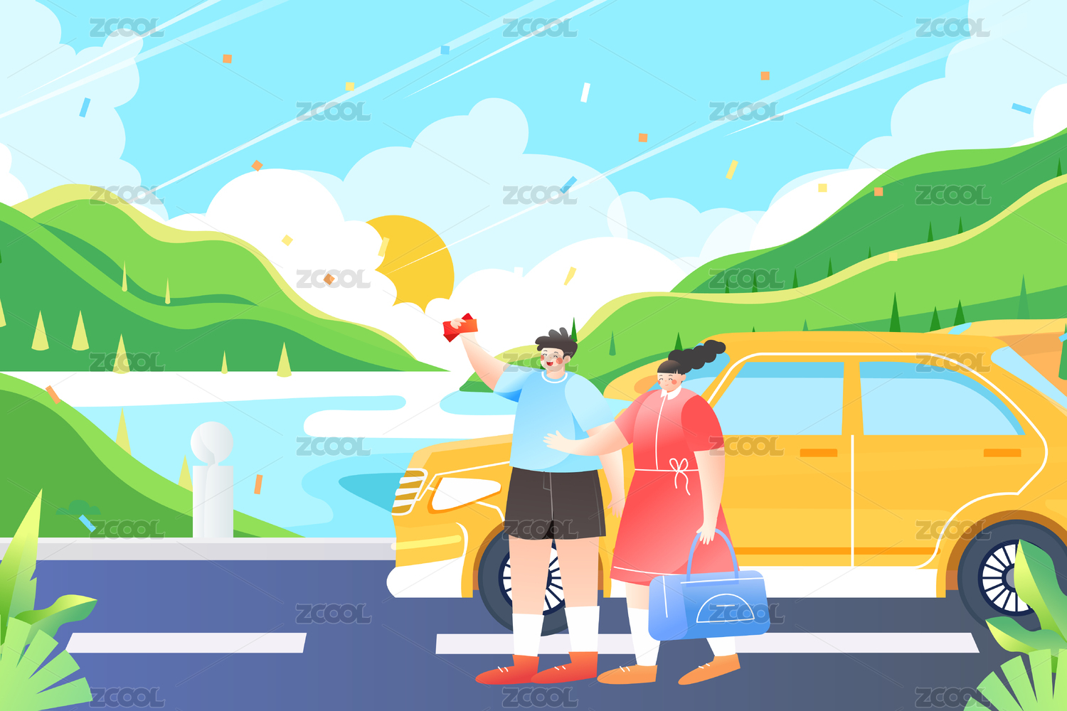 情侣自驾游矢量插画