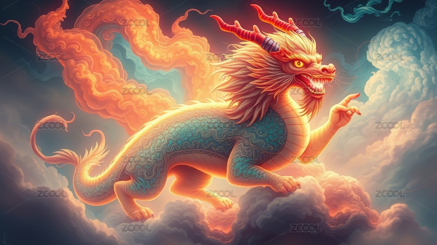 神兽,祥瑞, 中国风, 艺术, 绘画, 神话, 霸气, 威严, 装饰, 青色