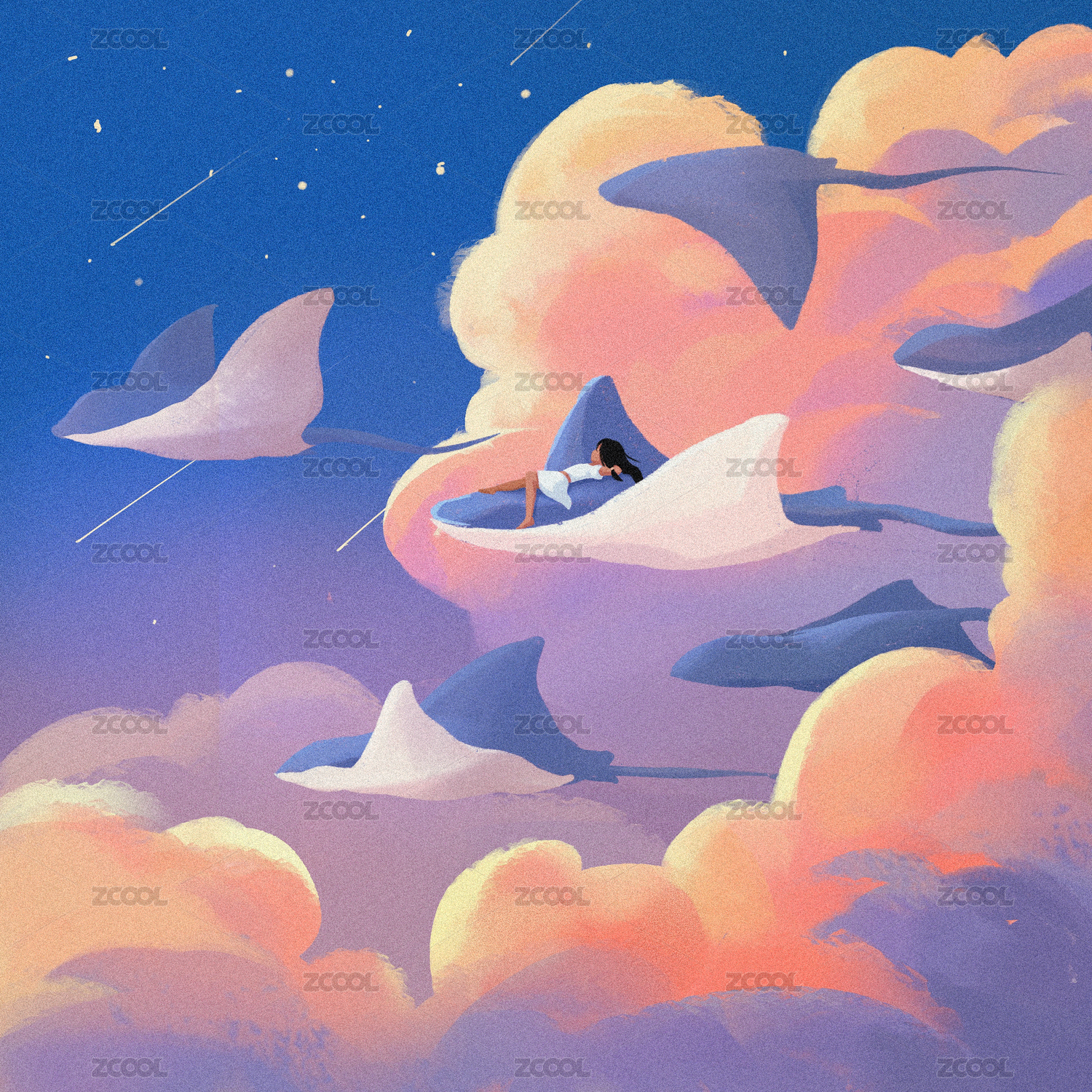 魔鬼鱼云海旅行手绘插画