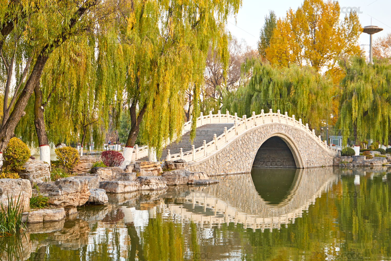 秋天青海省西宁市人民公园湖面上的拱形小桥
