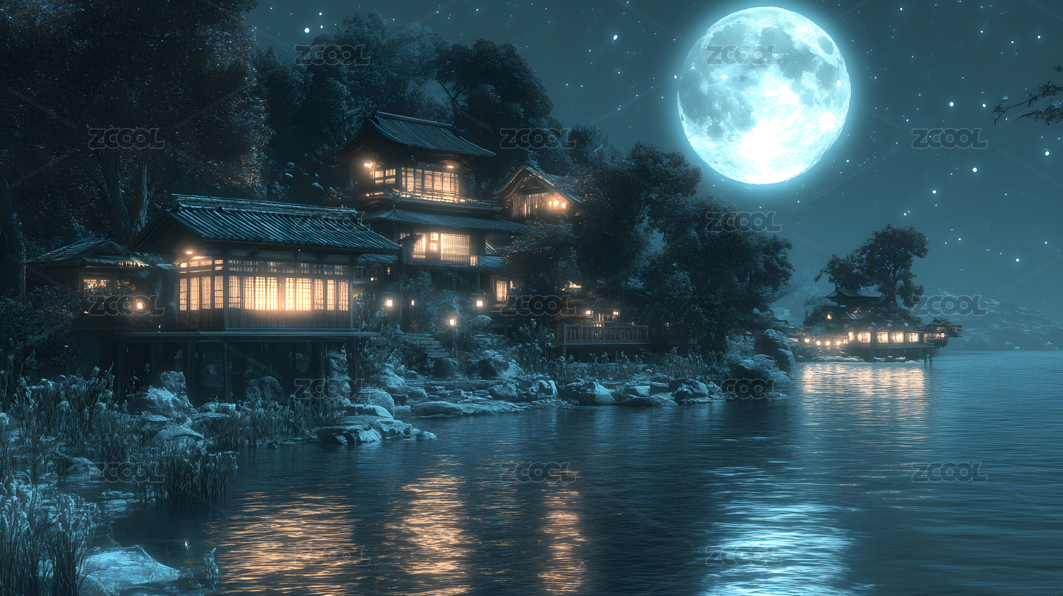 月光下的日式小屋湖边景色