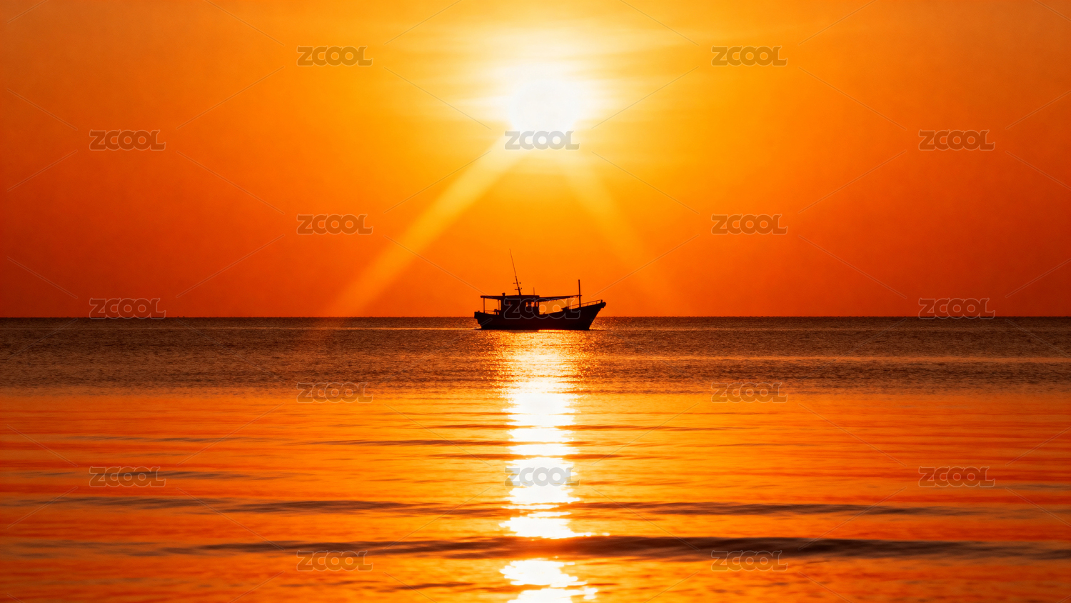海上日落孤舟剪影