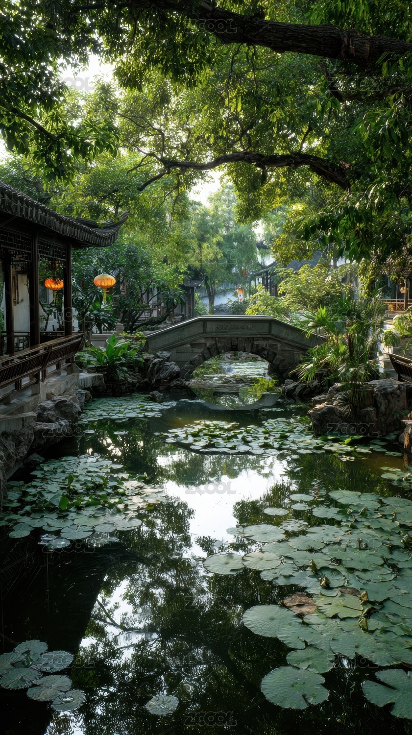 蓝天白云下的中国苏州园林的湖泊与凉亭