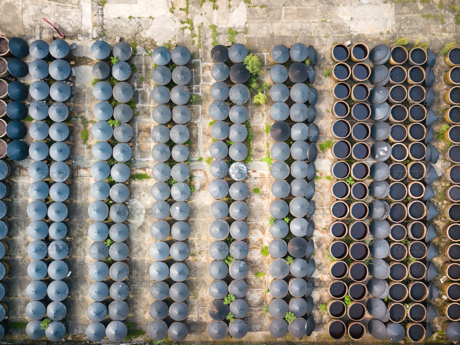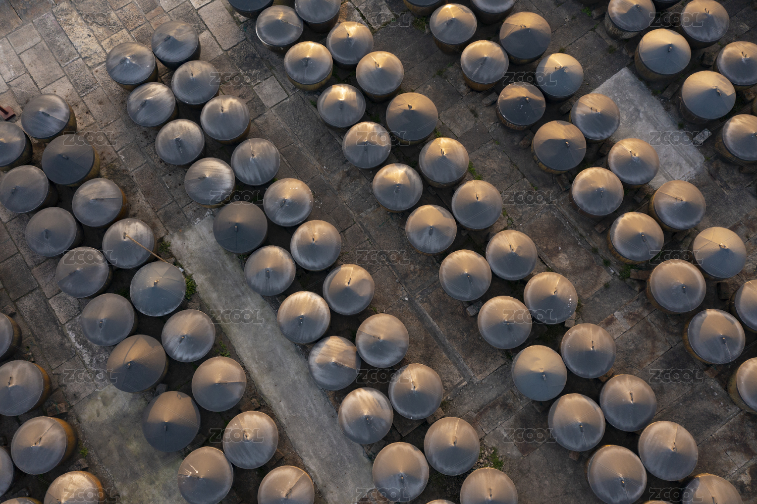 浙江绍兴安昌古镇非遗产传承排列整齐的酱缸
