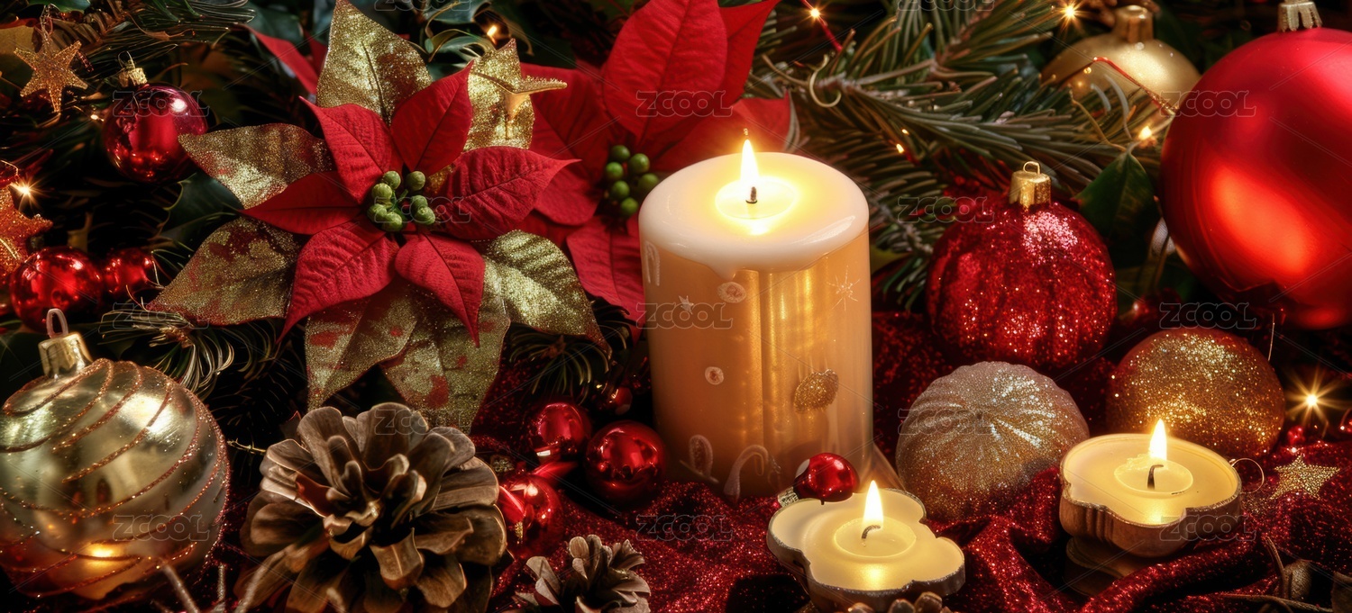 一根燃烧的蜡烛在圣诞节装饰品中间