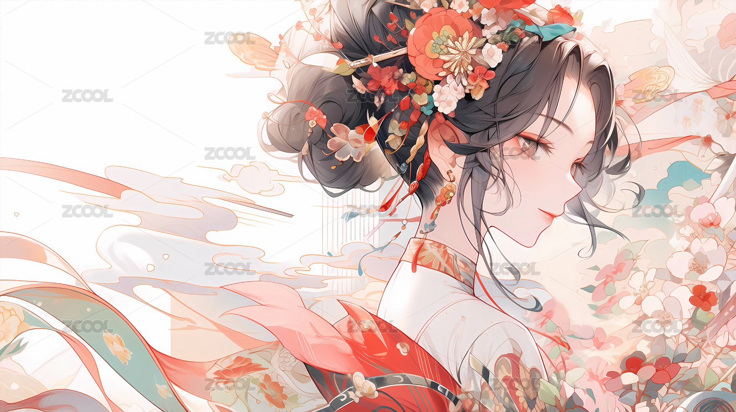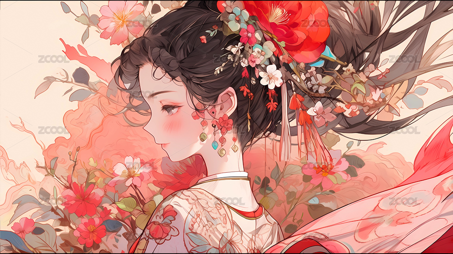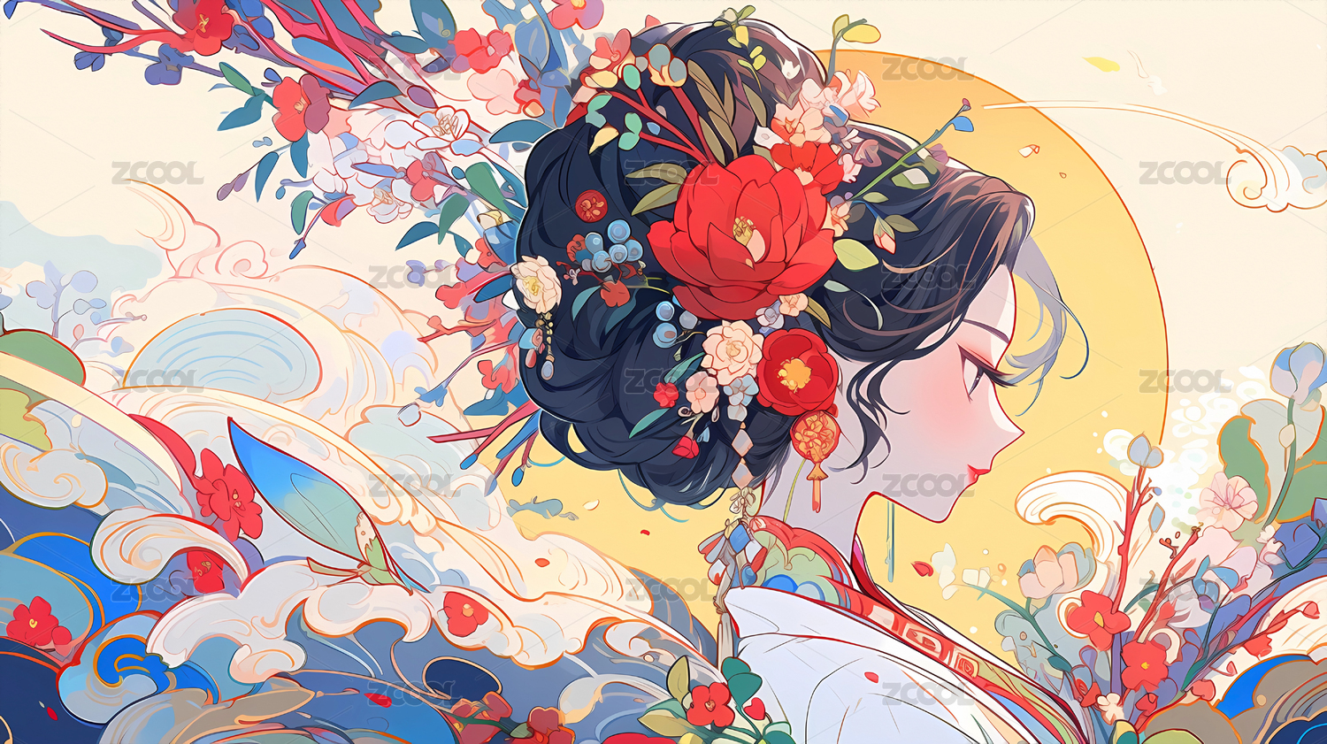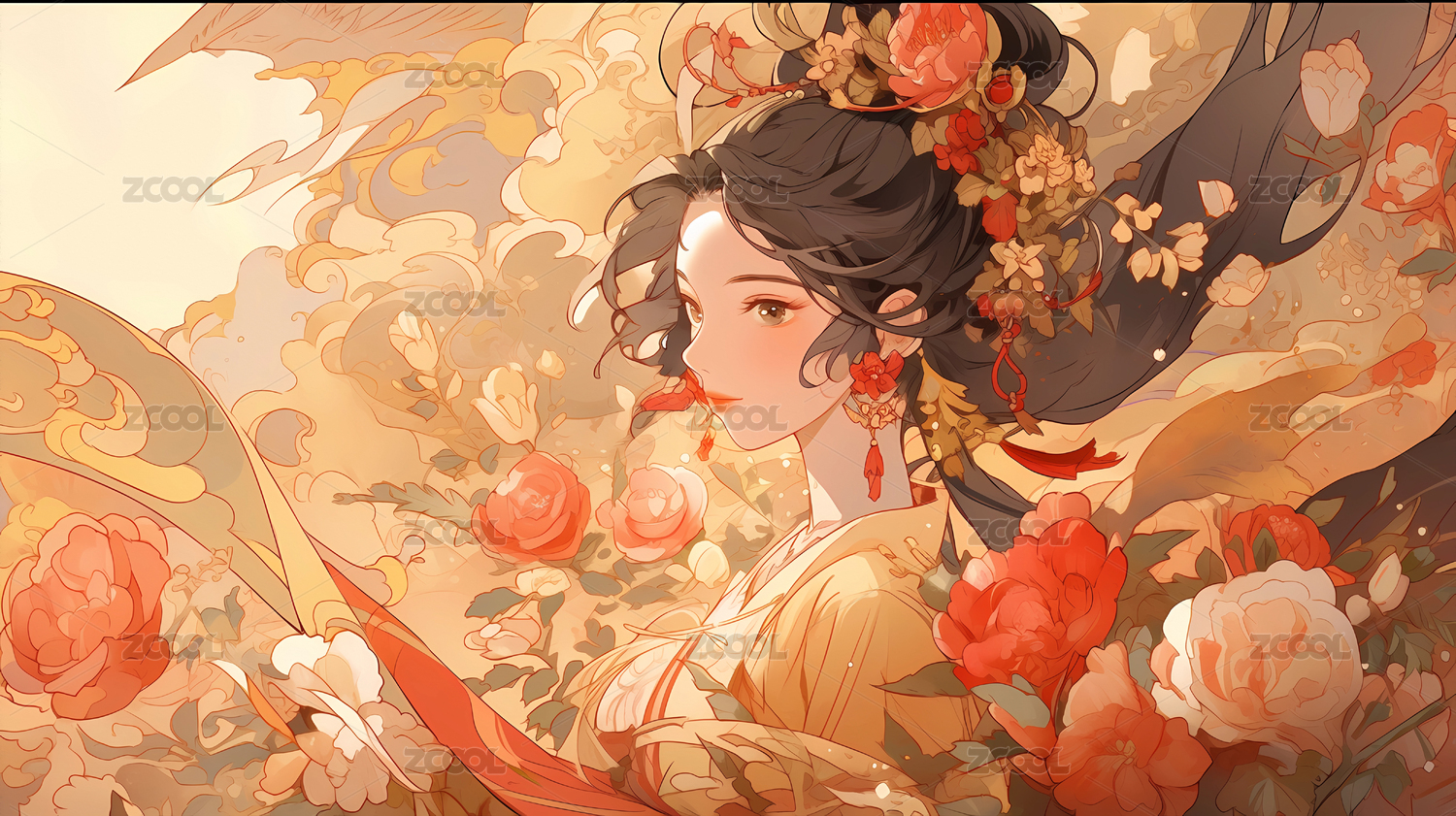 手绘,卡通,动漫,唯美,中国女孩,亚洲文化,女孩,亚洲女孩,盛装,吉祥