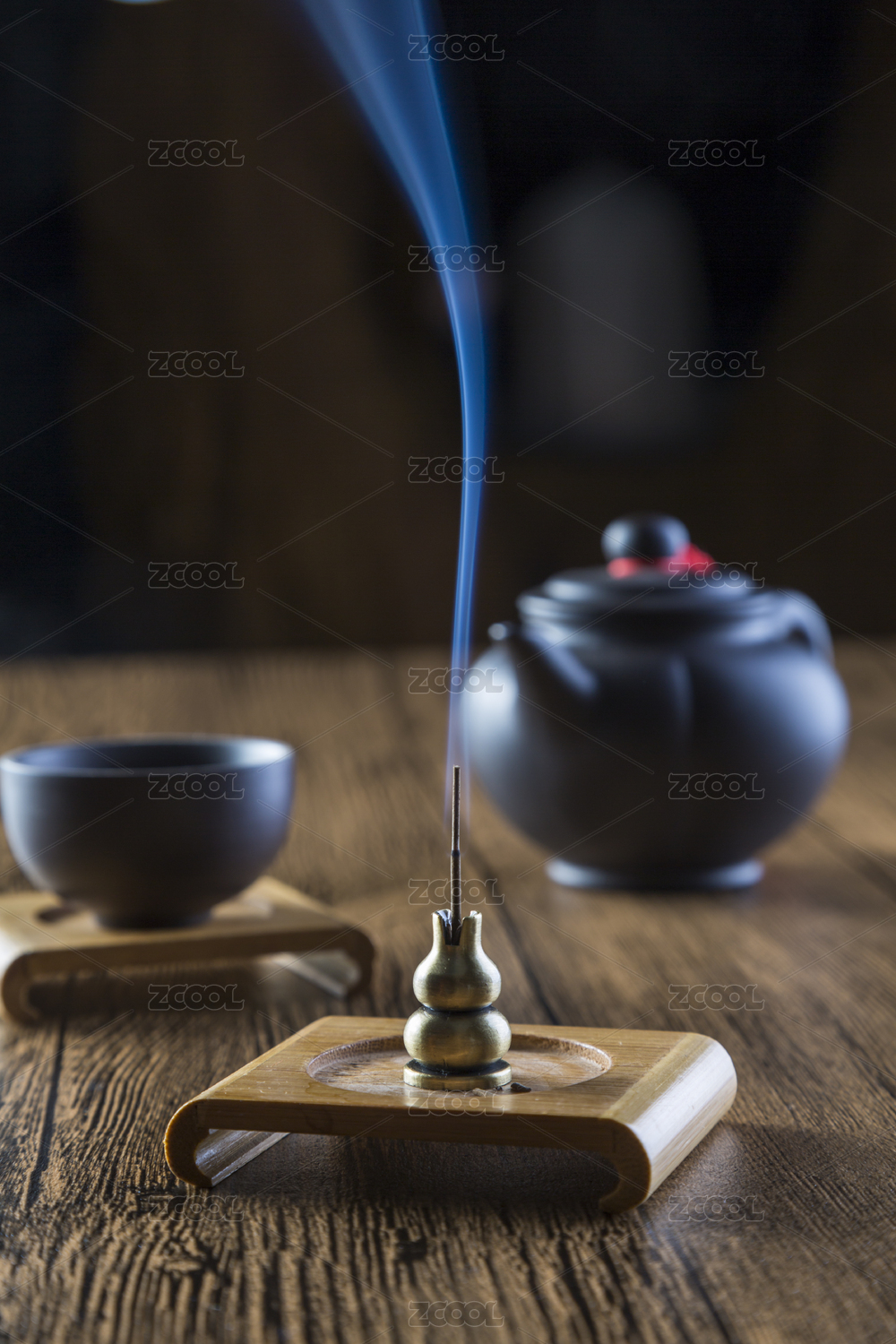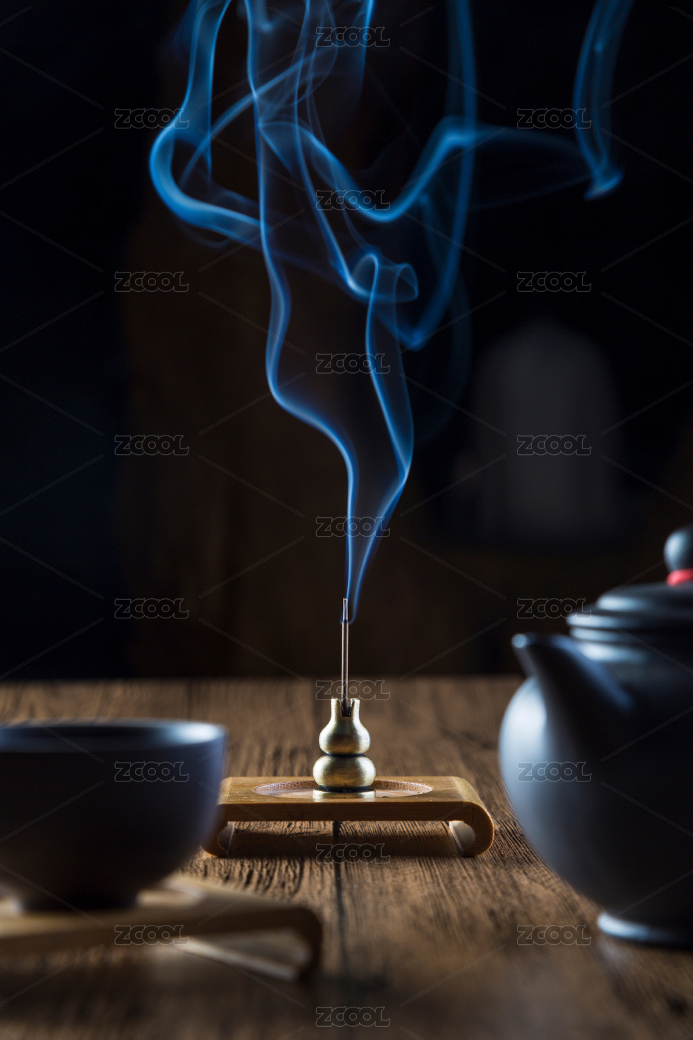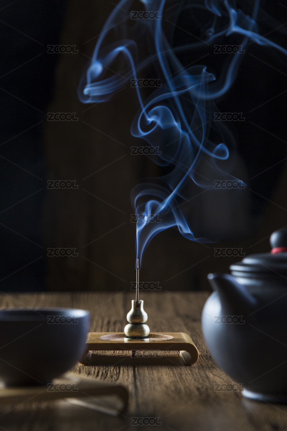 陶瓷茶具和袅袅飘散的沉香烟雾