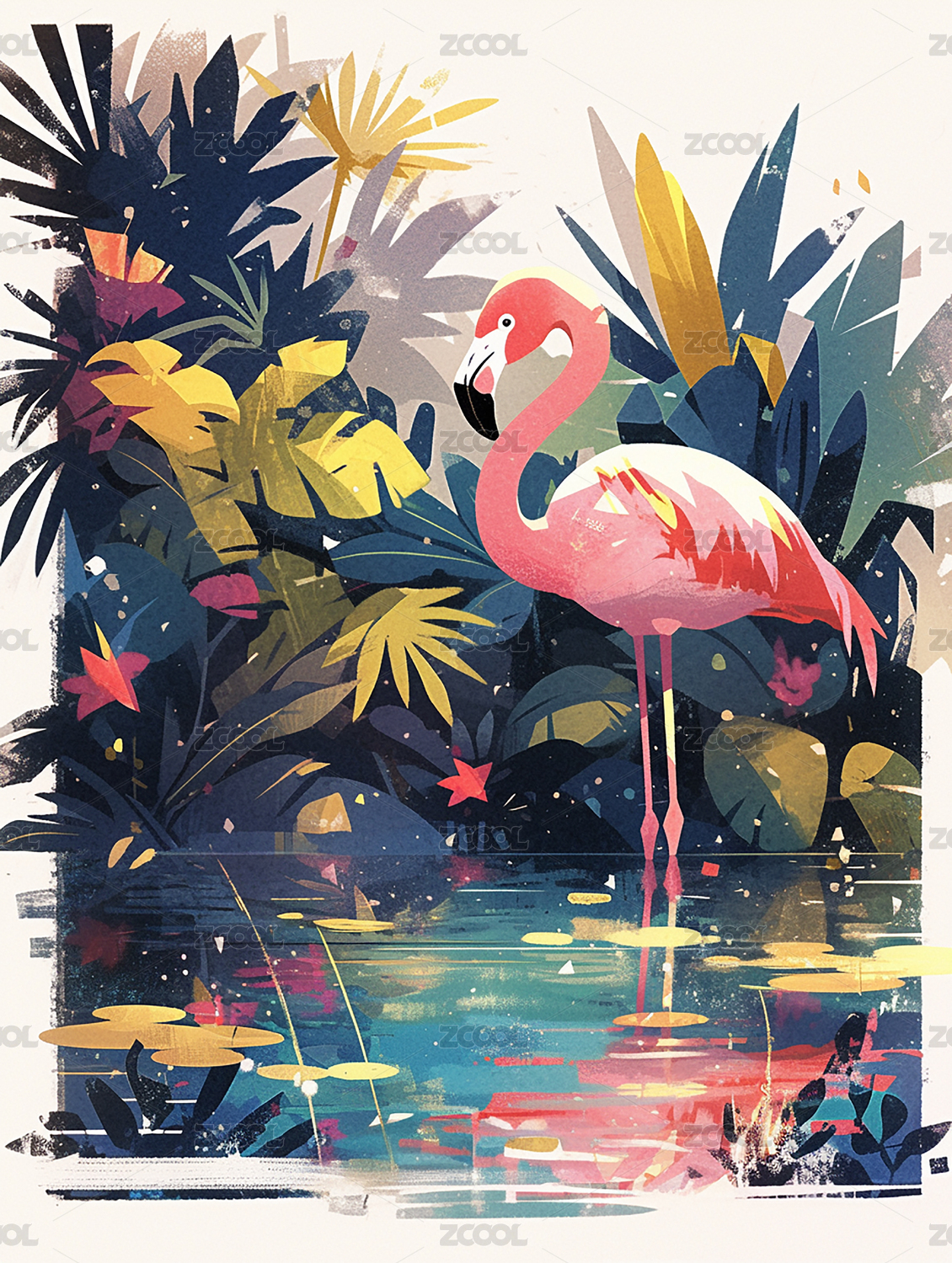 火烈鸟,复古,动物,清新,时尚,可爱,梦幻,花,花丛,花朵
