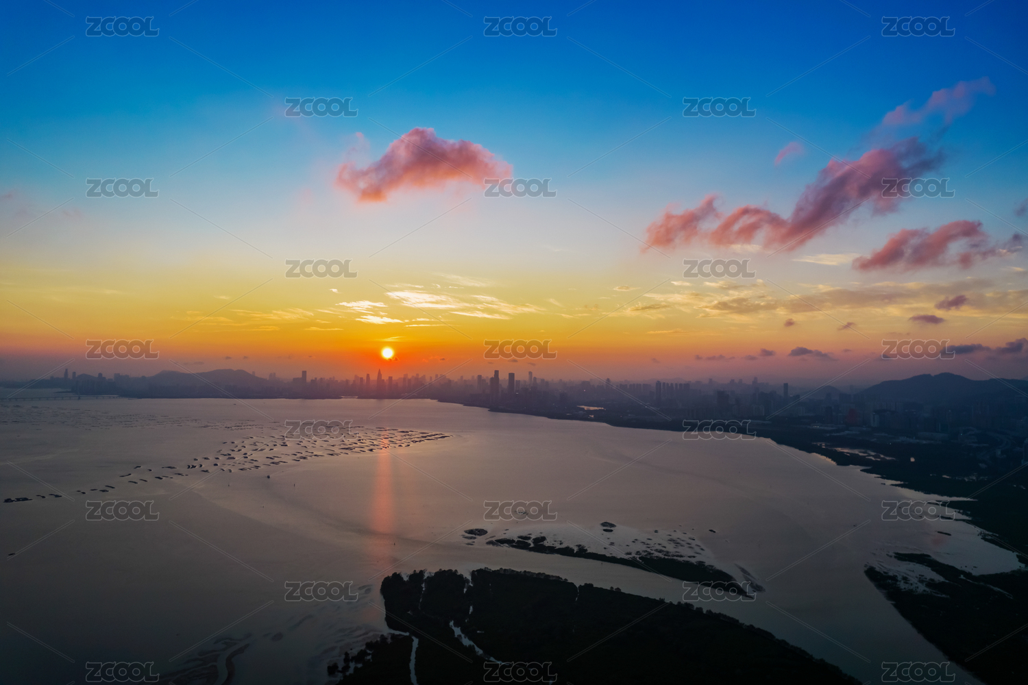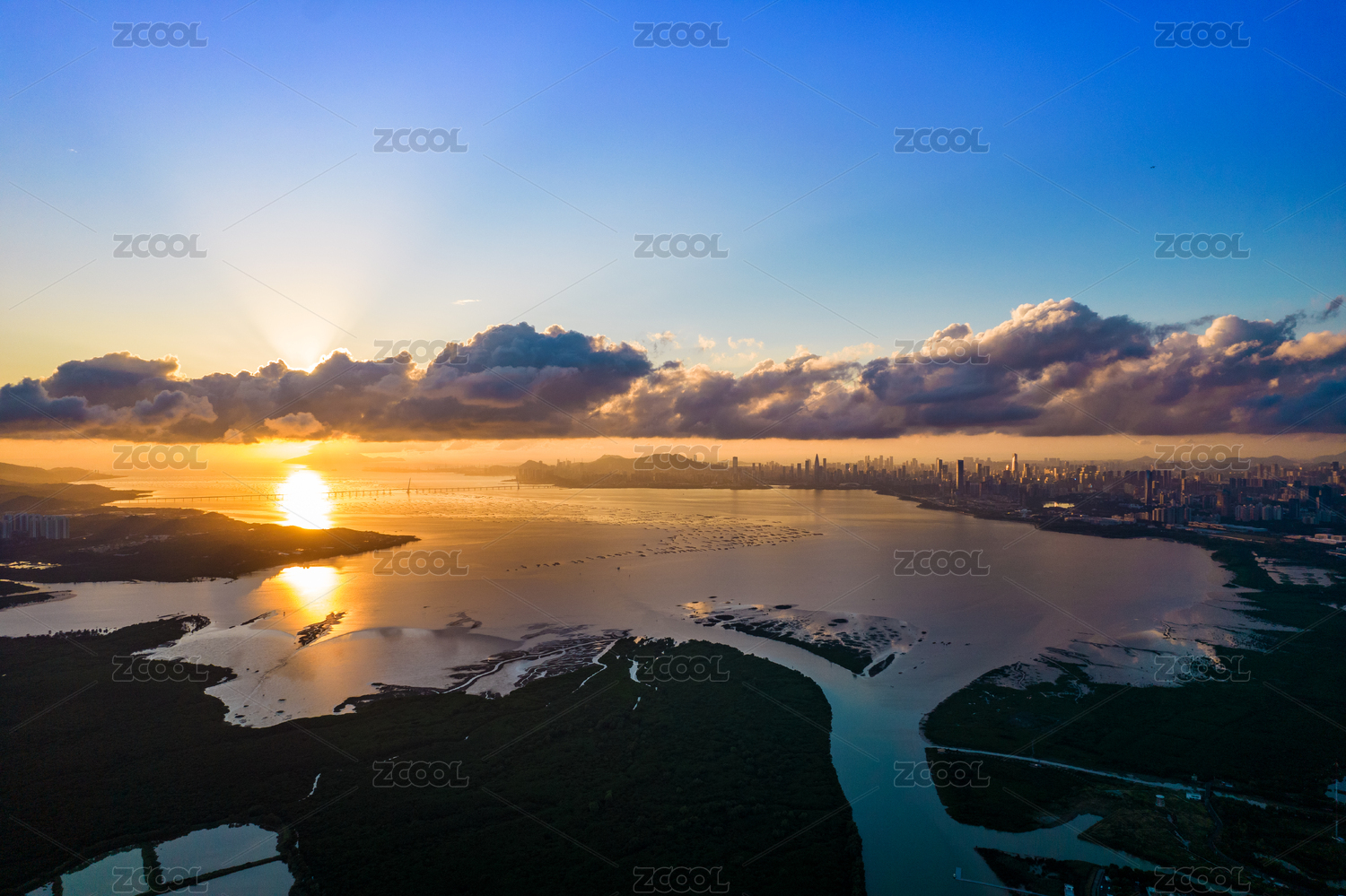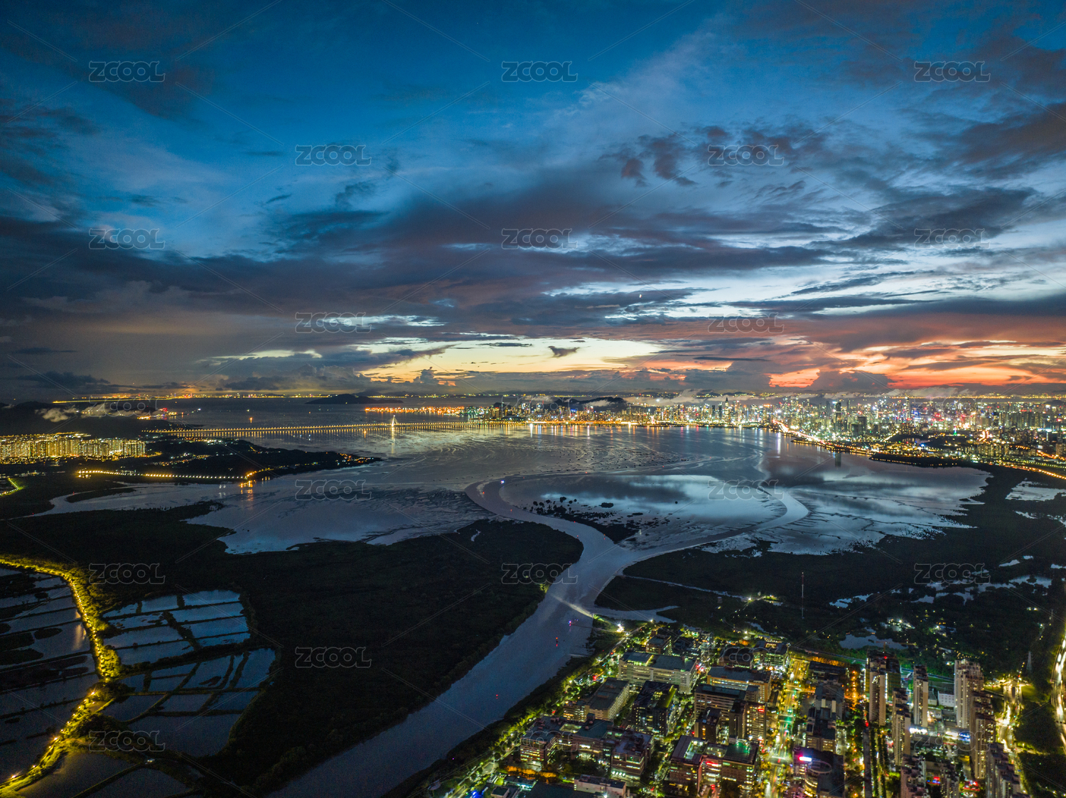 广东大湾区深圳前海湾涂滩日落城市夜景航拍