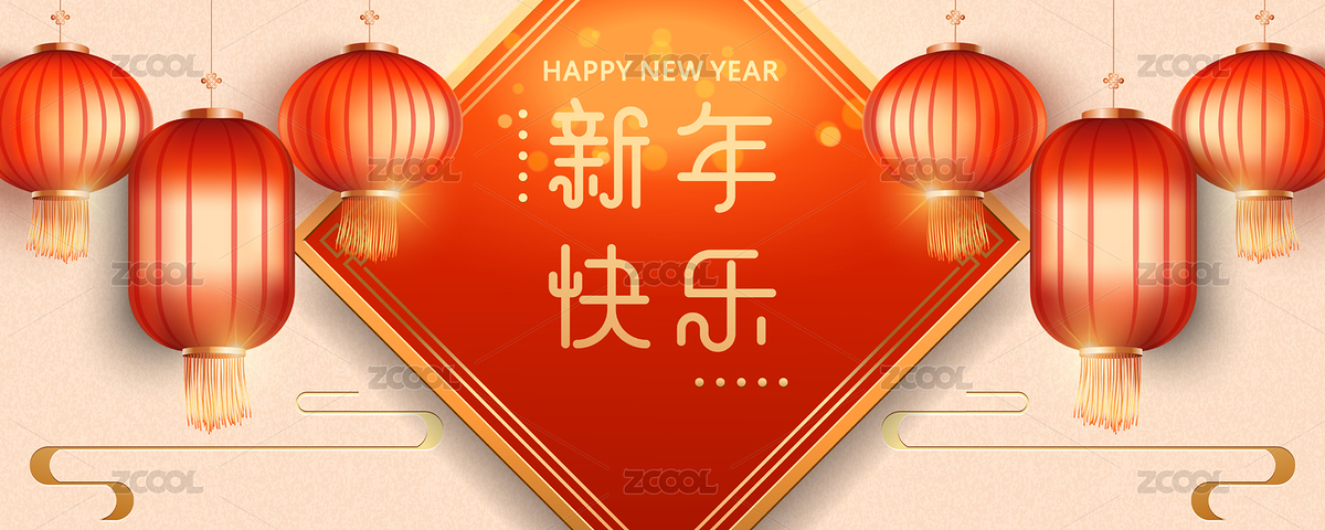 中国传统新年元素,金色背景图,新春对联—新年快乐,红色灯笼和祥云图案