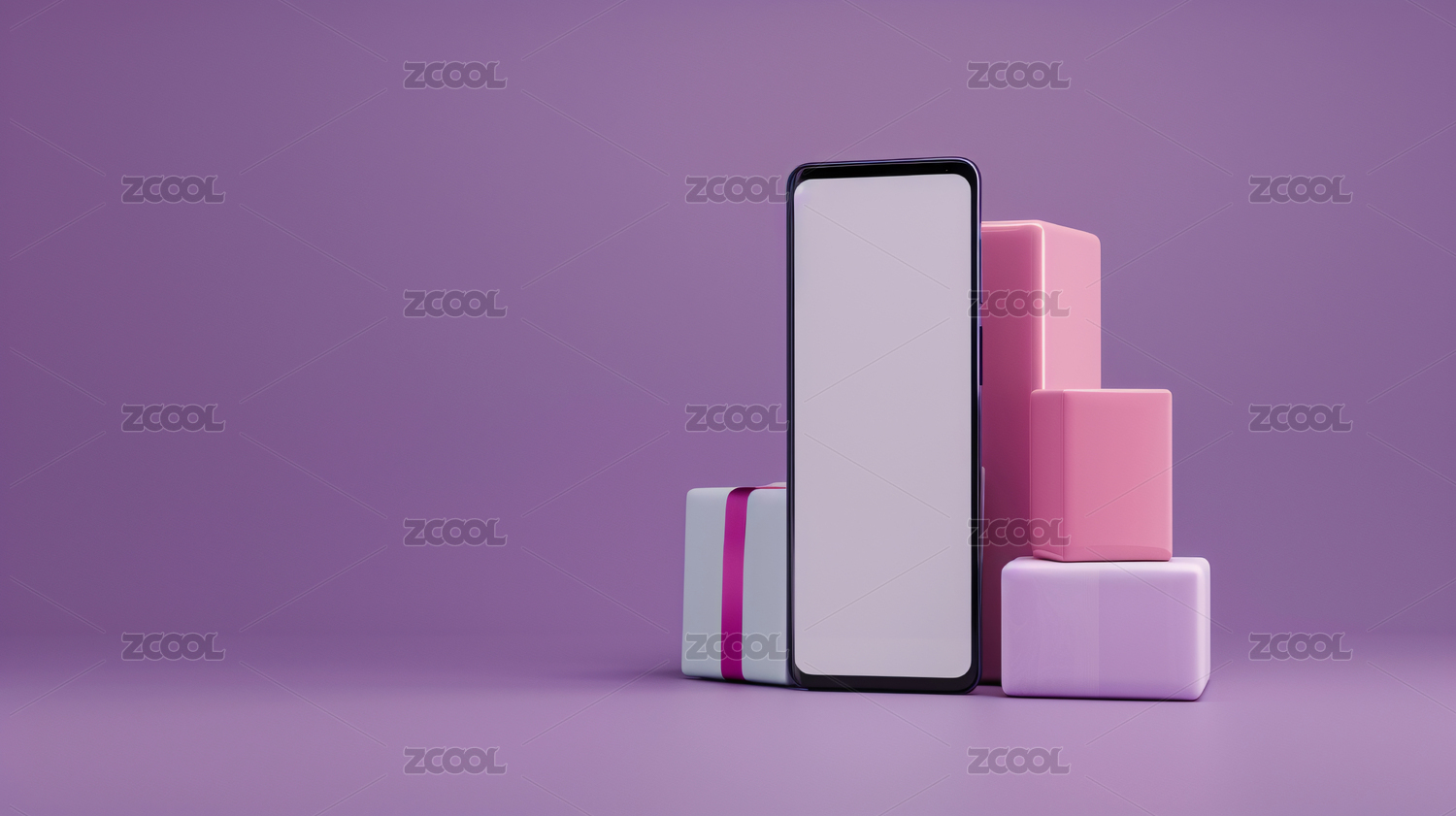 白色背景下桌子上的礼品盒和智能手机特写镜