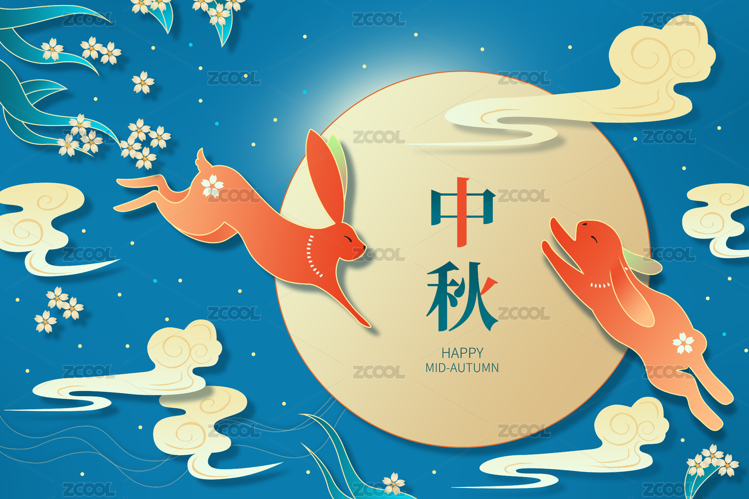 中秋佳节剪纸风满月夜玉兔与月亮插画
