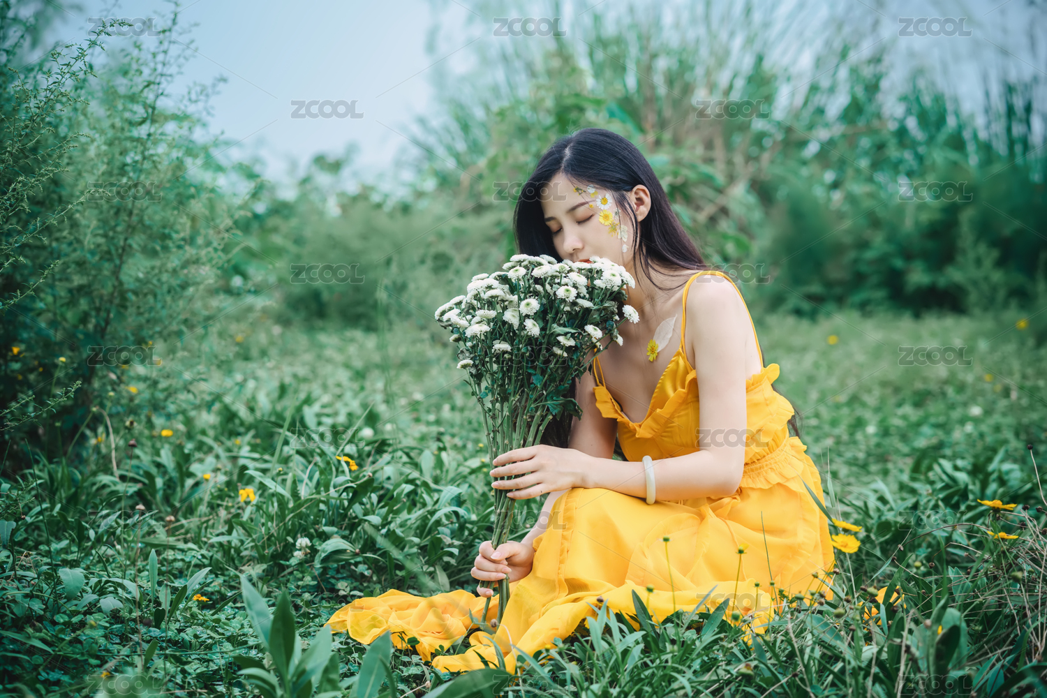 穿黄裙子手捧鲜花坐在草坪上的美丽女孩人像
