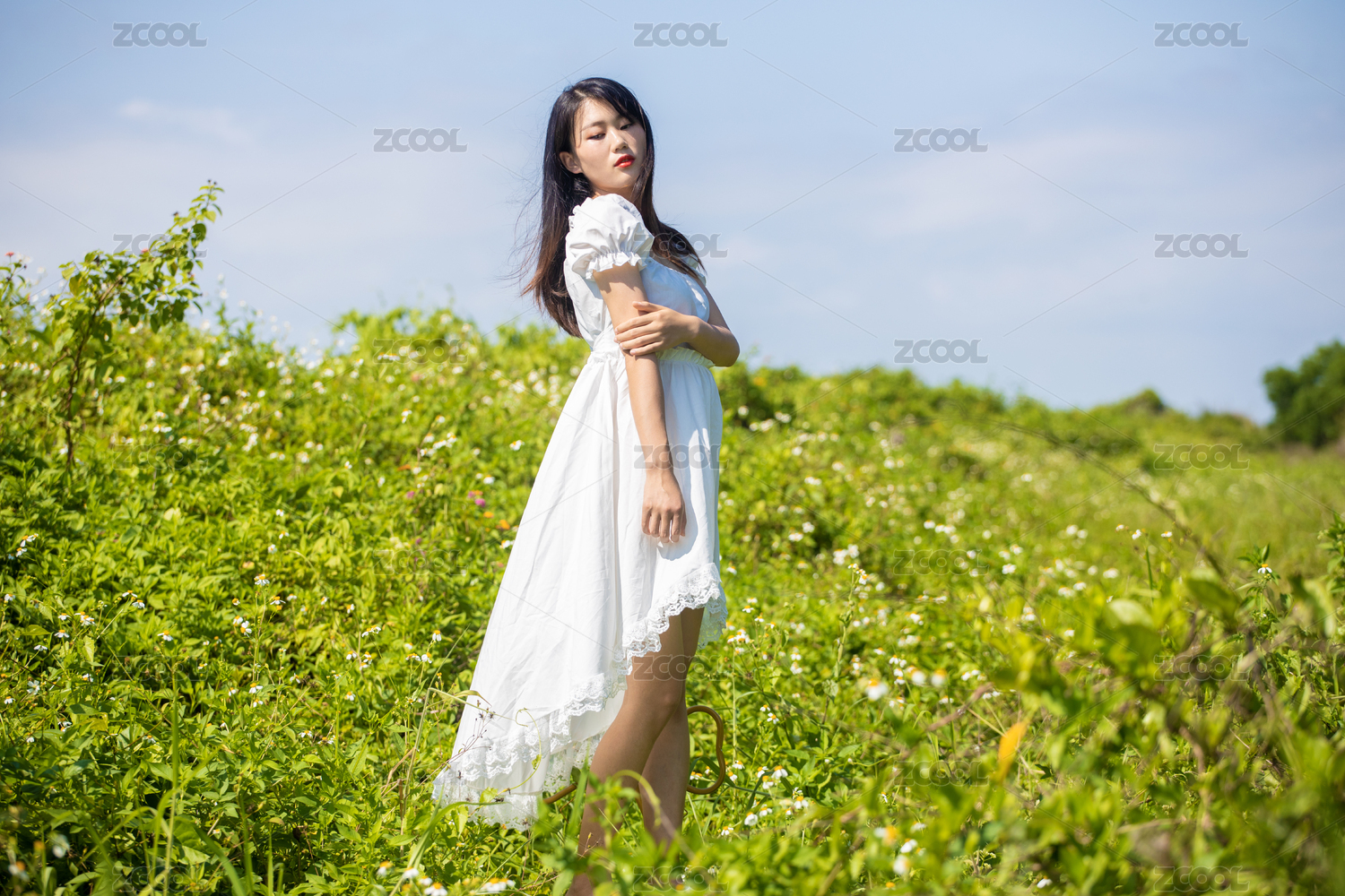 年轻漂亮的亚洲女人户外与白色礼服草甸