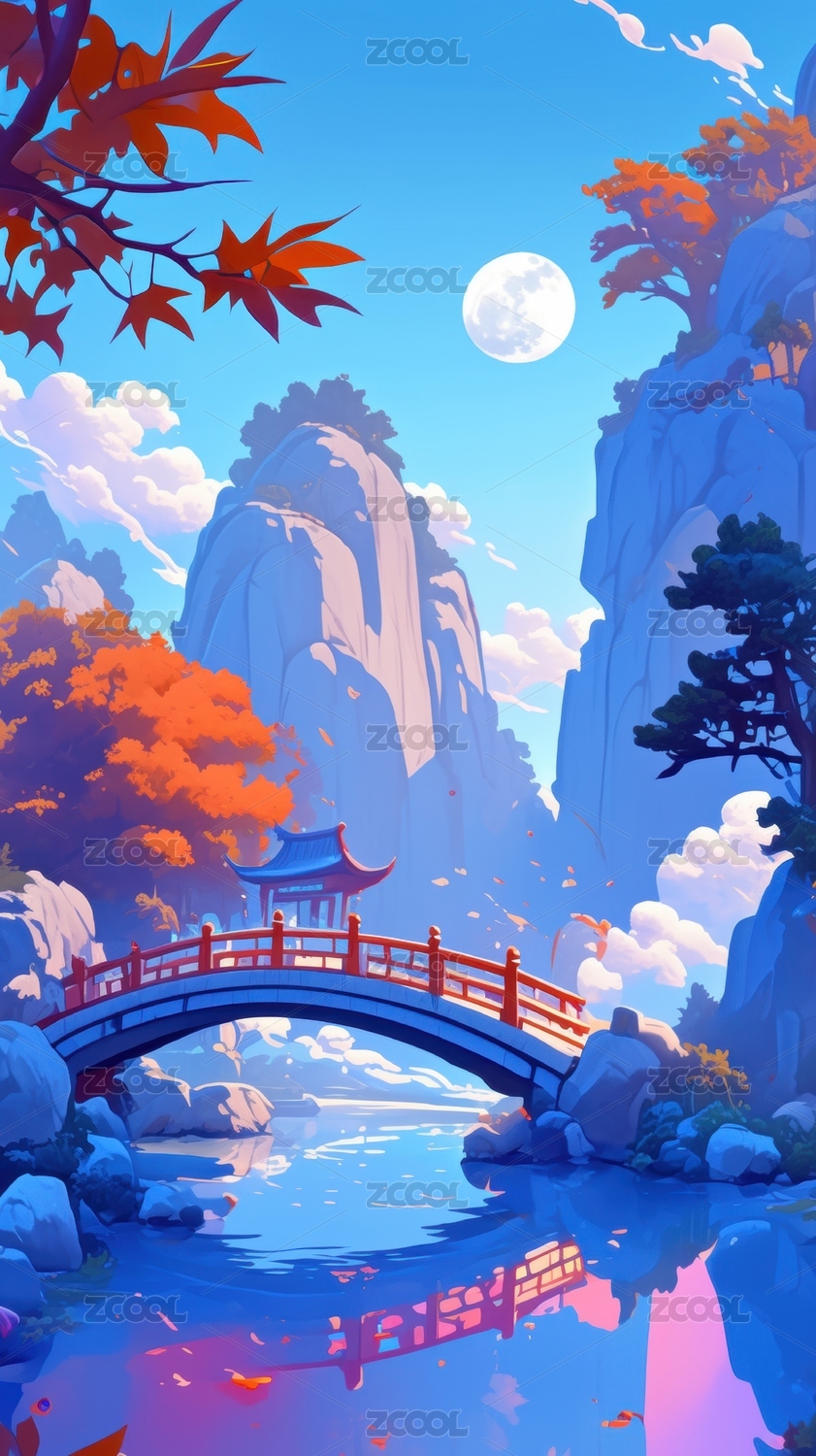 秋日山间红桥映月