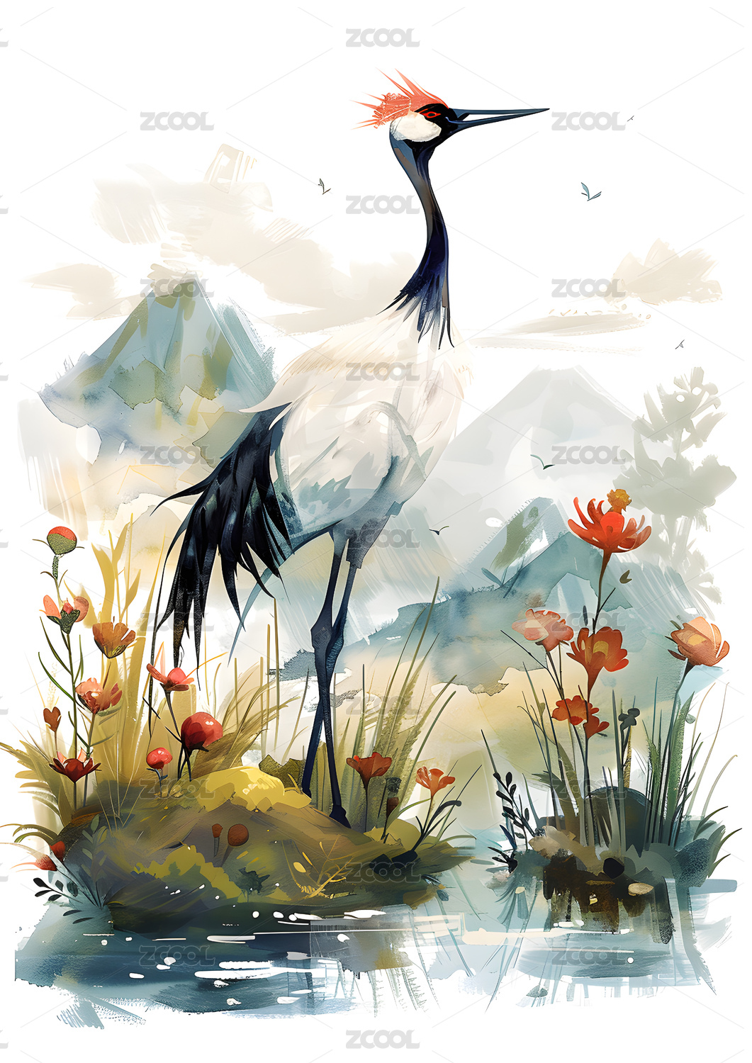 湖边一只仙鹤水彩插画