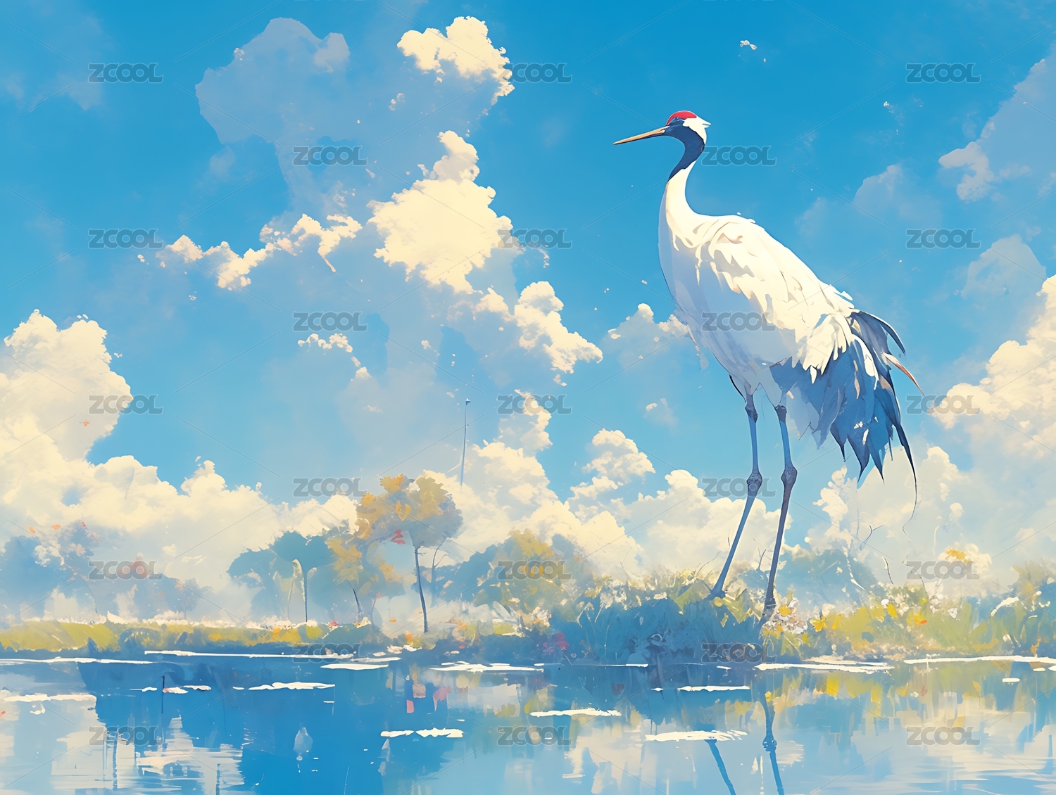 仙鹤,白鹤,丹顶鹤,插画,湖泊,国风,自然,保护,动物,鸟类