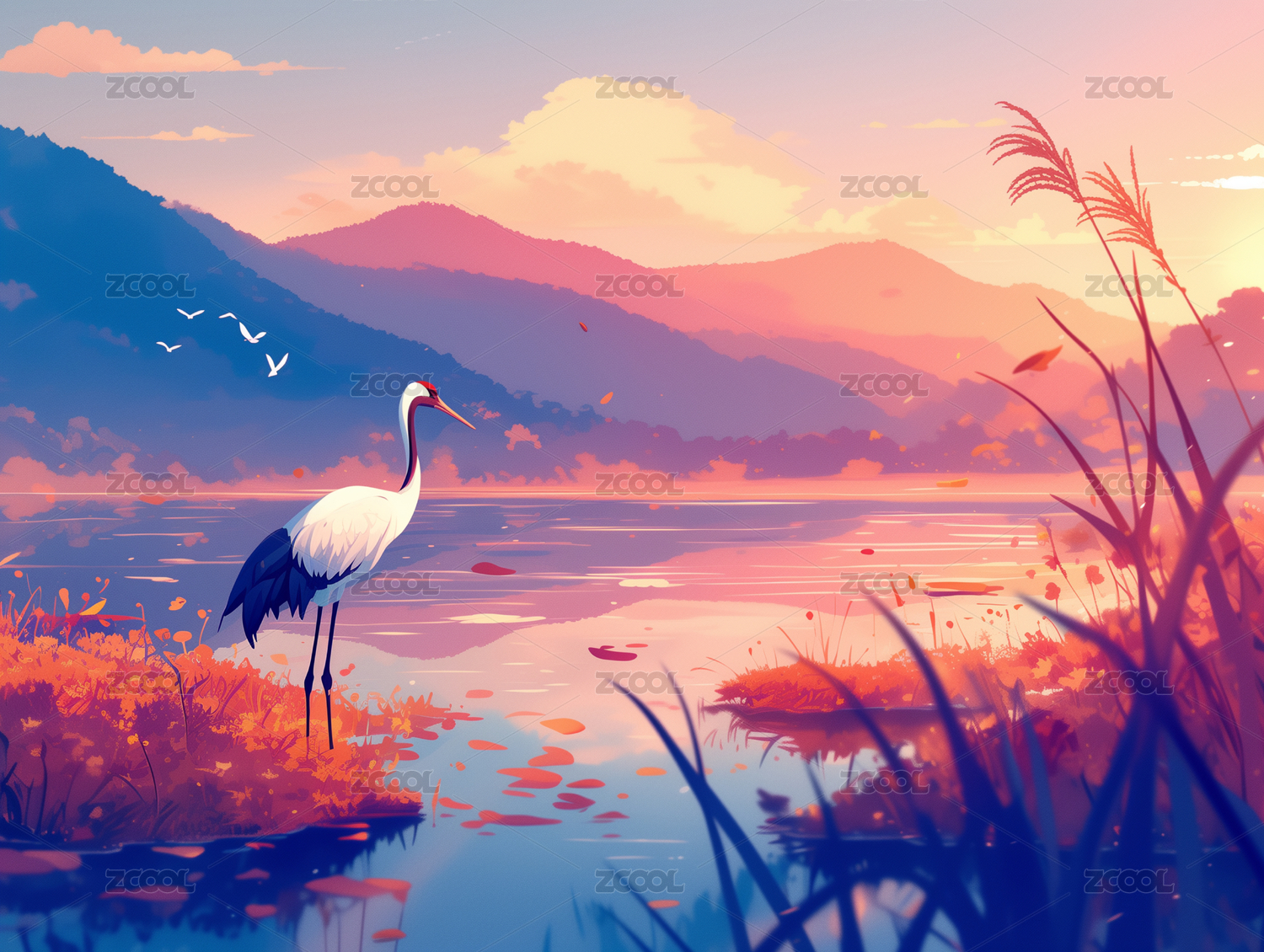 重阳节秋天仙鹤湖边插画