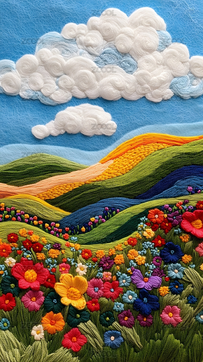 清新淡雅毛线毛绒编织自然山丘风光浮雕插画