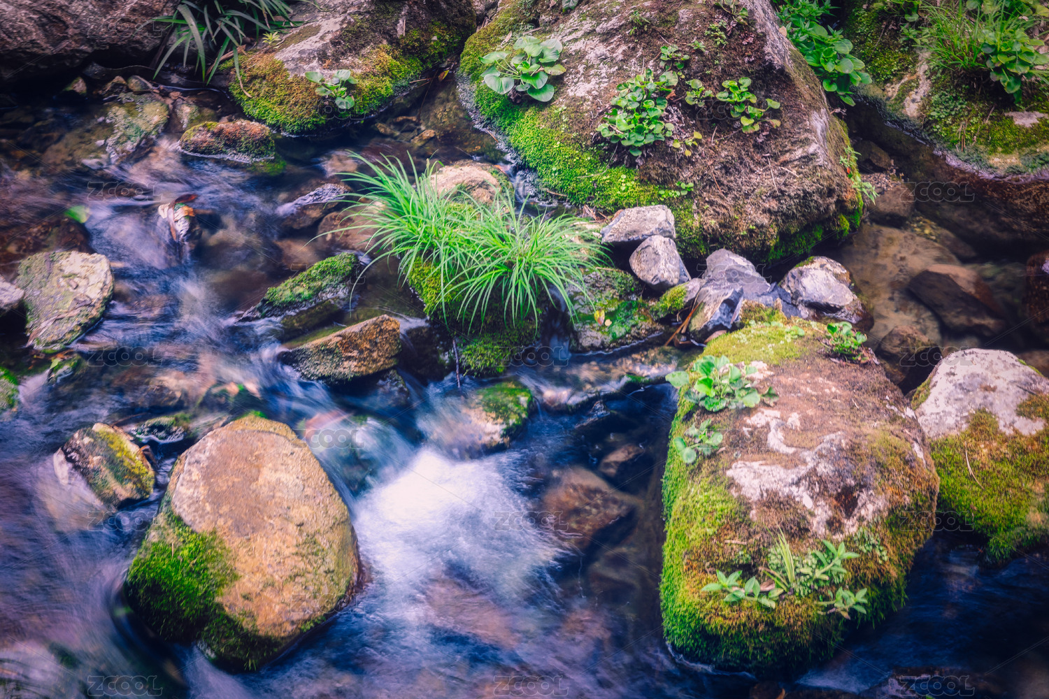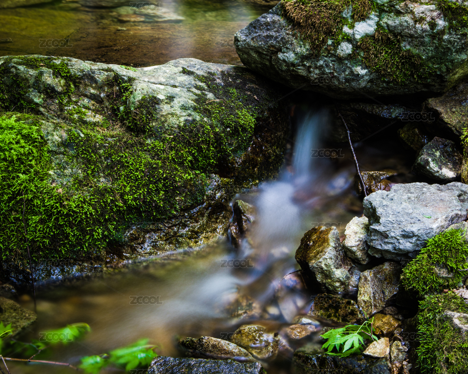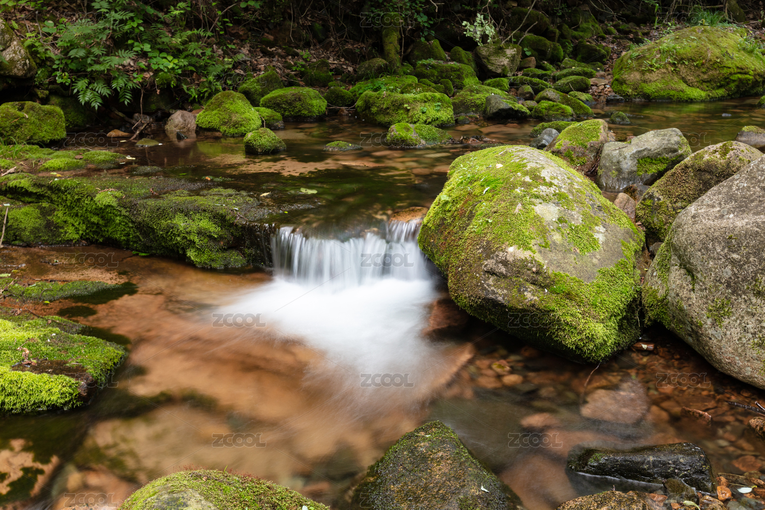 长满苔藓的小溪清澈的流水