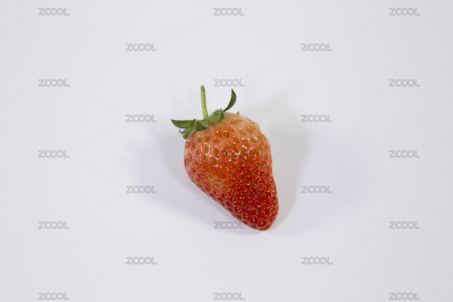 白色桌面上放着一堆散落的带着绿叶的草莓