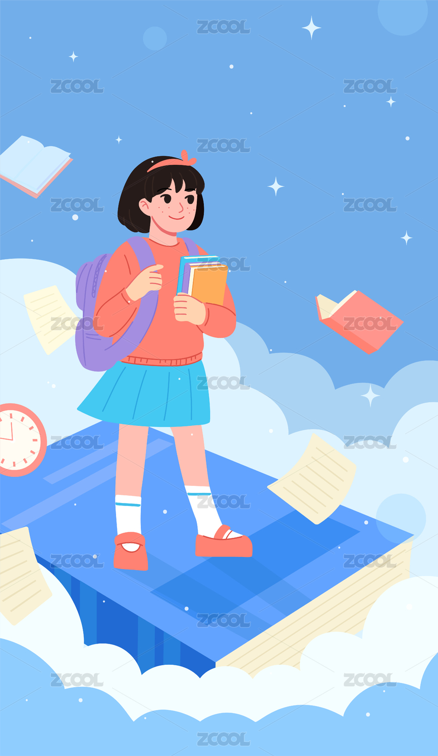 女孩拿着笔踩着书籍阶梯往上迈步跑
