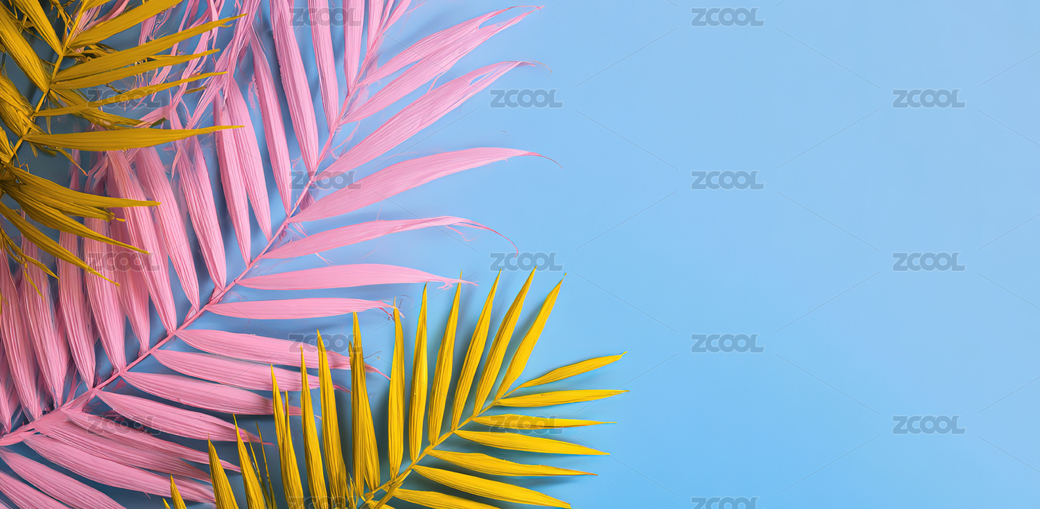 热带绿叶与彩色背景