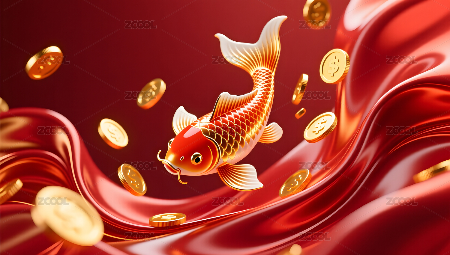 金鱼与金币在红色背景中.